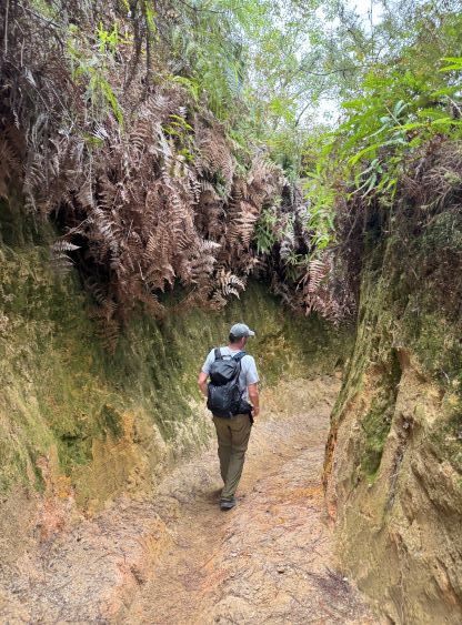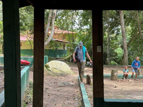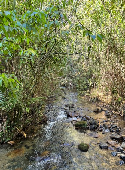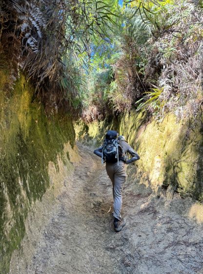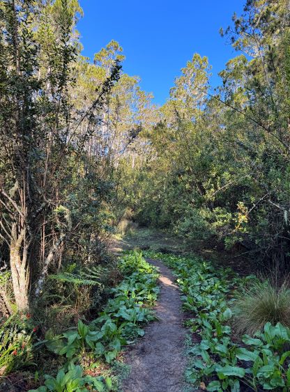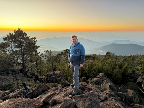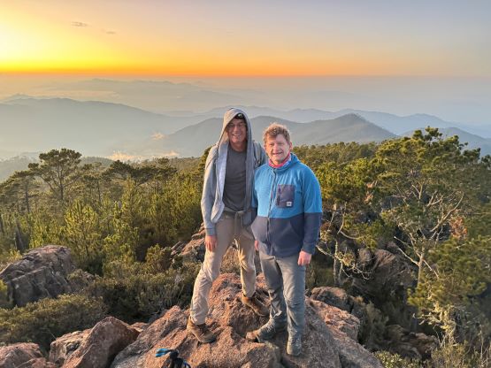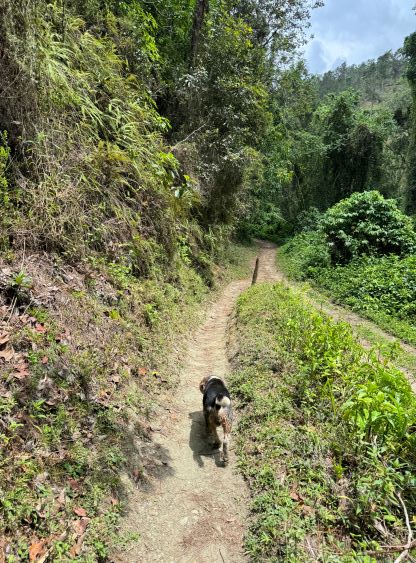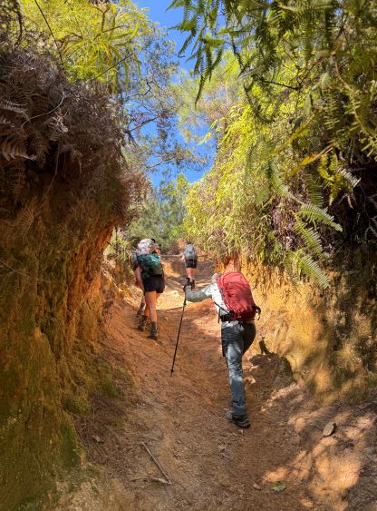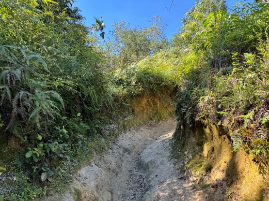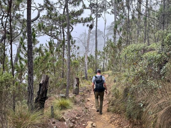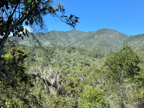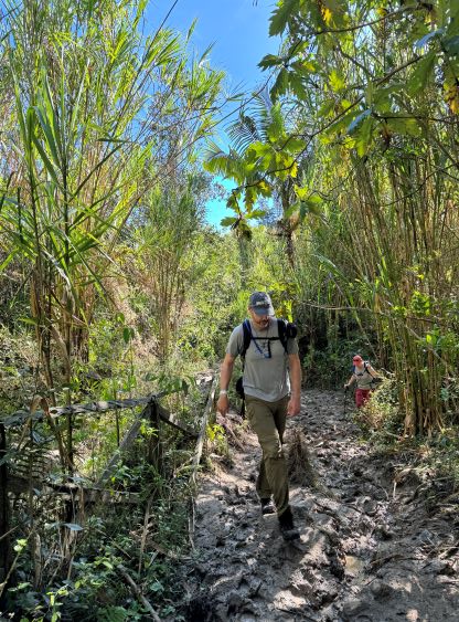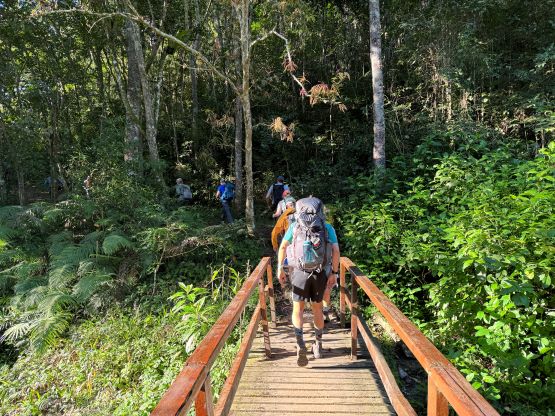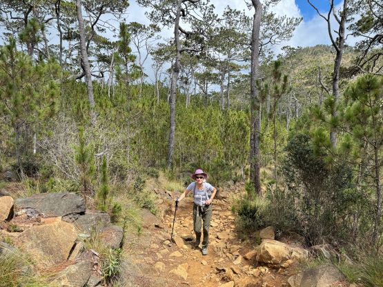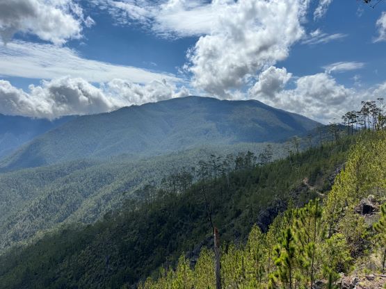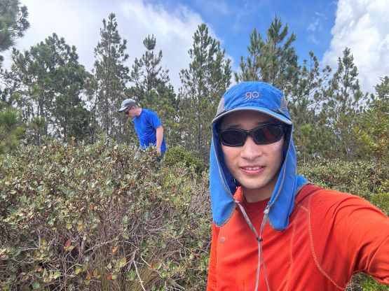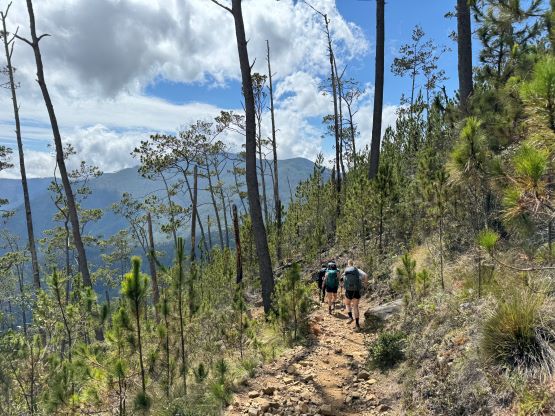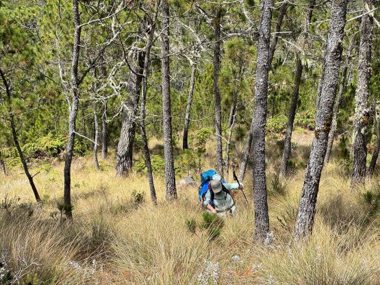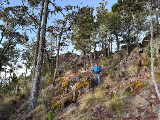 The distance of the approach to the campsite was about 18 km and the elevation gain was about 1600 m, and en route we would do a short bushwhacking detour to check out Pico del Yaque. This approach can be divided into three stages. The first stage was the initial few kilometers where the terrain was mostly flat and we plodded alongside a river. We crossed this river (more like a stream) multiple times on wooden bridges and there were some muddy stretches to content with. I think we took at least one break at one of the “rest stops”, mostly to regroup. The next stage was a long but gradual ascent for 800 vertical meters onto the broad SE Ridge of Pico del Yaque. The trail gradually transitioned from “dirty” to “rocky” and we would certainly not appreciate that rocky stuffs on the way out a day later. We again, took numerous breaks to regroup and the day was starting to become very hot. The weather was apparently not ideal for hiking but at least we were only carrying our day-packs so I wouldn’t complain. We then plodded up the SE Ridge of Pico del Yaque until we were less than 100 vertical meters from the summit on the north slopes. A few of us had discussed the possibility of tagging this peak on the approach day so I waited until Craig J. and Linda showed up. The three of us made a quick dash up the north slopes to the summit thrashing through some boulder fields covered in high grass. The terrain was awful and required a lot of care, as we constantly discovered hidden holes that could easily twist an ankle. The summit was forested and the weather was mostly cloudy so most of us who went there regretted. I considered this bonus peak a classic “type 2 fun”, that we sure did not enjoy it while doing it, but will appreciate our determination many years later when we look back at our 2024’s peak-logs.
