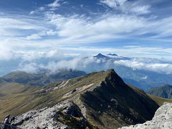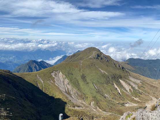 On the other hand, we did not want to hike too fast as the purpose of this ascent was to properly acclimatize for the bigger peaks coming up, so we went at a modest pace. The previous hike we did was as high as 3500 m and now we were ascending to 4450 m so we couldn’t hike too fast anyway. The ascent was short and no-brainer as we just needed to follow the old road and the trail to the very summit with hardly anything worth noting. The trail did become very steep on the final 200 m elevation gain and we were constantly high-stepping on grass fields. The final summit ridge also required a bit of scrambling and the summit was indeed quite obstructed. Thank to the man-made structures we couldn’t get that 360-degree view despite the weather being cooperative. We did also find out that the contours on Gaia map were incredibly wrong and we found that on many peaks in this country.