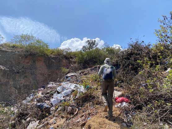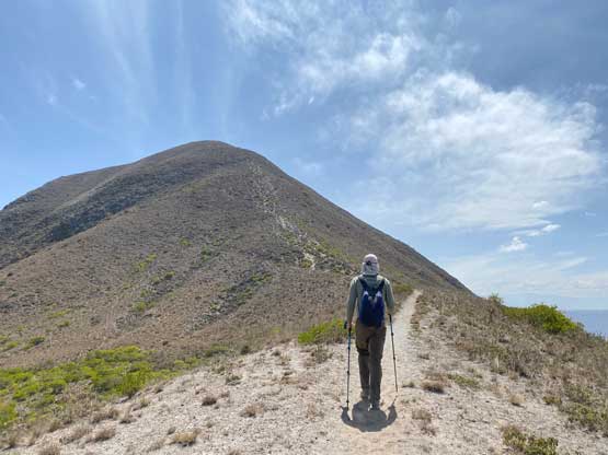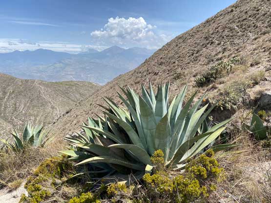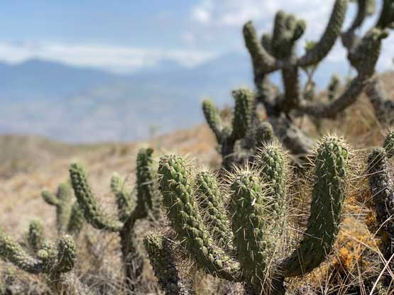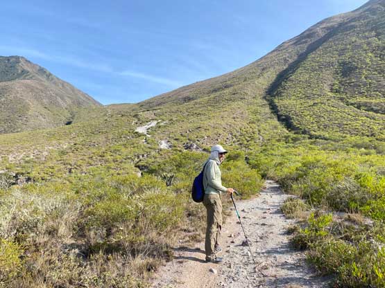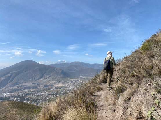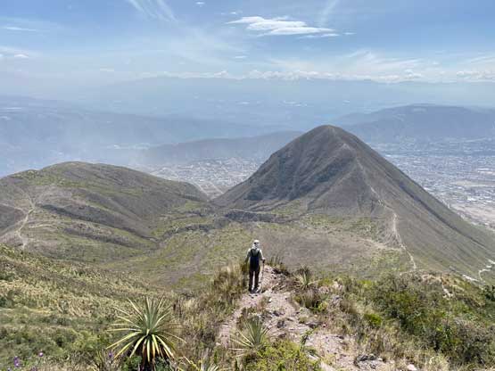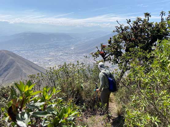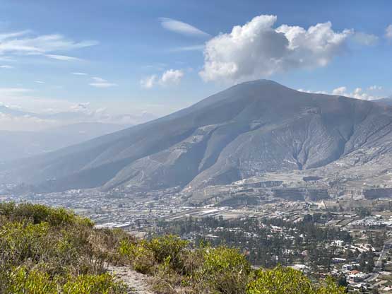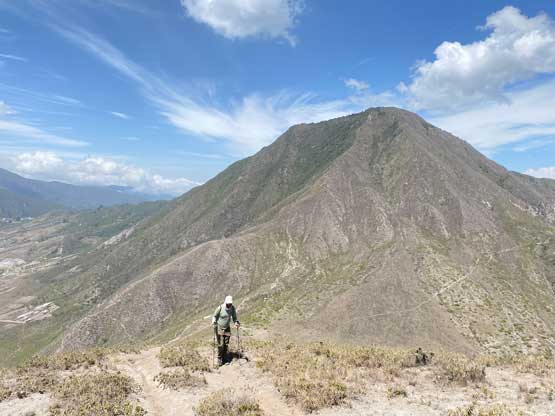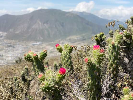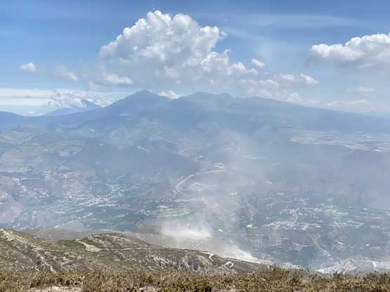 The next morning Adam arranged an Uber driving through Cabify app that would show up at 8 am or something. Adam had some troubles with that app but eventually managed to convince a driver to come. The drive to the trail-head took over half an hour and this day was shaping up to become a beautiful bluebird day, at least in the morning. Adam told me that the previous two days were 100% overcast with nothing to see. As we drove north away from Quito we entered some dry desert-like landscape that seemed rather odd given the proximity to equator. The hike was actually longer than we thought as the two peaks combined would give us over 900 m elevation gain, so we decided to take our time and start it out slowly. The trail-head was rather messy with garbage dumps and the driver seemed to question our sanity, but we informed him that we had experience. Sure enough, a lady came with two aggressive dogs (one unleashed) and the unleashed dog bit Adam on the thigh. I had previously been bitten in Peru and I hated the dogs in South America. Most of them are well behaved but some were just assholes.