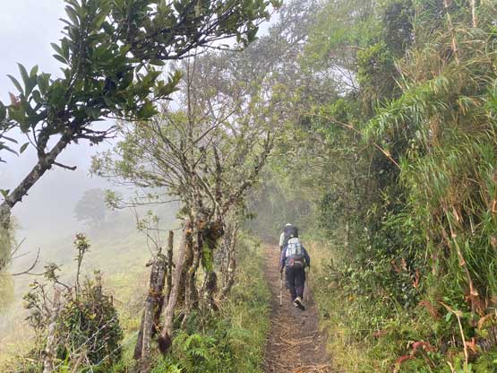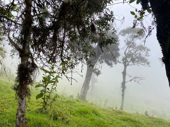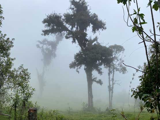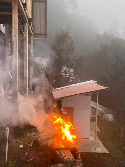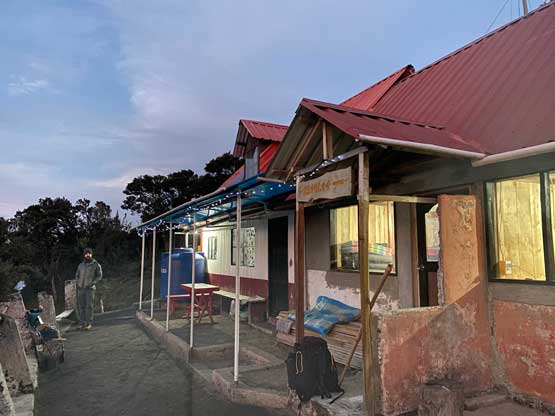 A thunderstorm brew in overnight and we got some heavy downpours. It didn’t last too long, but when we woke up in the morning the peak, which was visible from our “home” was covered in fresh snow. Our guide informed us that ice axe and crampons weren’t needed but with the fresh snow I decided to carry crampons regardless. Adam had left his crampons in Quito but he had microspikes here. Getting picked up by the guide was the first crux of the day. The head person of Andean Summit Adventure, Elizabeth told us that the pick-up time would be 12:30 pm and we thought that’s a bit too late. The weather usually collapses in the afternoon and we didn’t want to do the approach in rain. Elizabeth eventually compromised our needs and changed the pick-up time to 11 am. The next challenge was for our guide Francisco to find our Air B&B. It seemed like his previous clients were all based in hotels so when we gave him the address instead of a hotel name he was confused. Francisco called Adam via What’s App and immediately spoke a bunch of Spanish that none of us could understand. Adam had to call Elizabeth (who speaks good English) to inform her the pick-up and communication difficulties and Francisco eventually showed up at around 11:30 am. Francisco actually spoke fine English but he assumed we would speak Spanish. This showed that Volcán Tungurahua isn’t a popular peak among foreigners. A separate driver showed up together with Francisco and drove the 4 of us to the park’s office near the trail-head, about 1000 vertical meters up. The road would require 4×4 on the upper reach but was overall not in a bad shape. We got there in about half an hour and had lunch that Franciso brought. The infrastructure wasn’t as civilized as on Chimborazo so we just ate the food inside the park’s office. It was drizzling lightly outside.