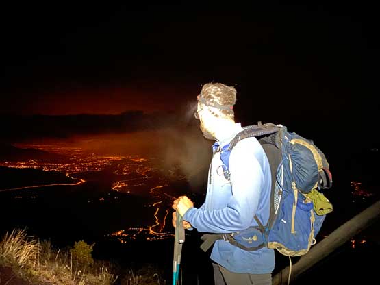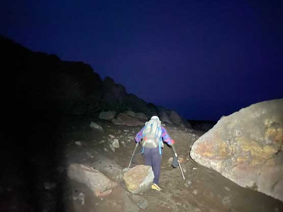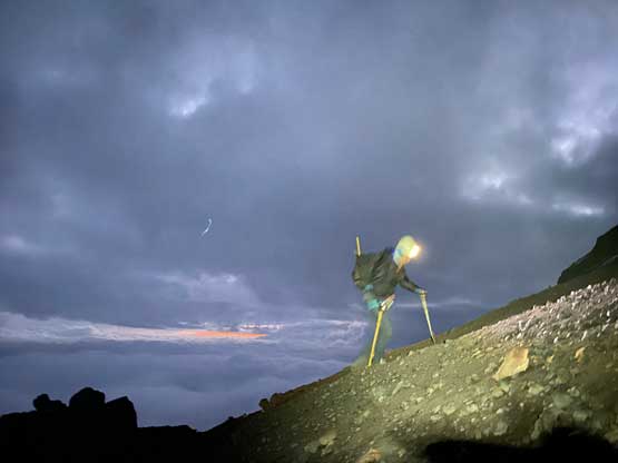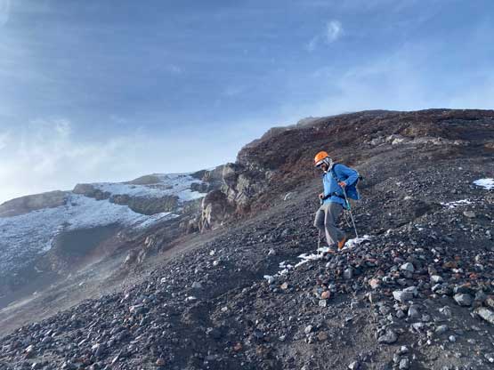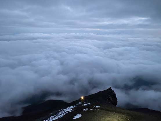 For this peak I opted to wear the trail-runners for the approach while carrying my Trango Tech mountaineering boots for the summit day. I knew the volcanic choss woud likely destroy the otherwise, brand new boots but I also didn’t want to haul the heavy ass 6000M boots for this ascent. About half an hour after starting we were above the treeline. The main “trail” was still easy to follow but there were already diversions here and there. Francisco seemed to know the route well so we just followed his lead. At around 4300 m elevation Francisco made us to don helmets even though this ascent was at most “class 2”. At around 4600 m we caught up to the Ecuadorian team and started passing them. Meanwhile the horizon was brightening up so that by the time we passed that entire team we no longer needed the head-lamps. The other team was short-roping the class 2 scrambling section. Francisco didn’t even bring a rope for us which I was glad. The terrain would be too “easy” to consider roping-up for Adam and I but we could see some of them were definitely struggling. This was shaping up to be an incredibly beautiful day despite the iffy weather forecast.