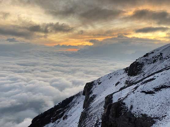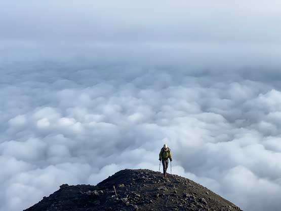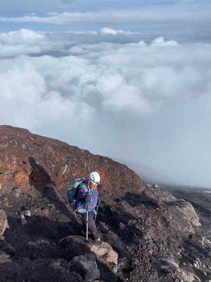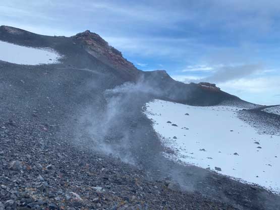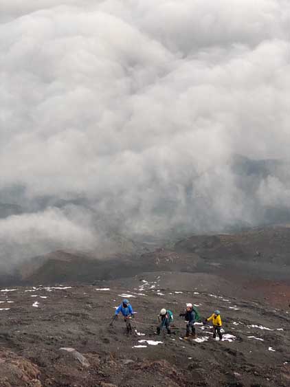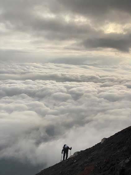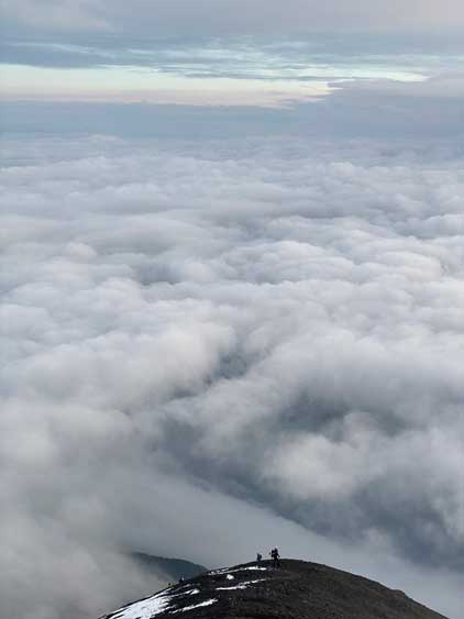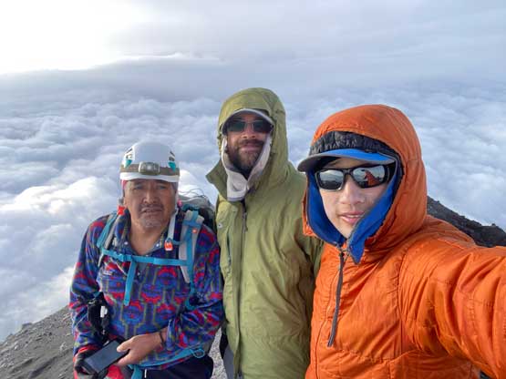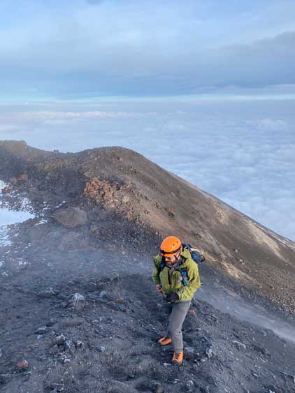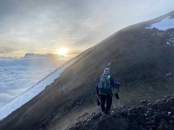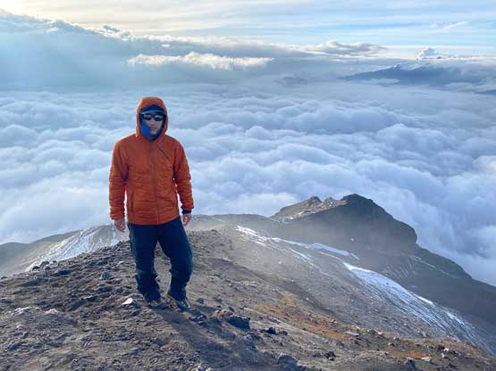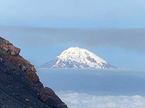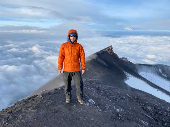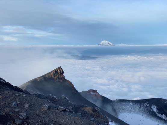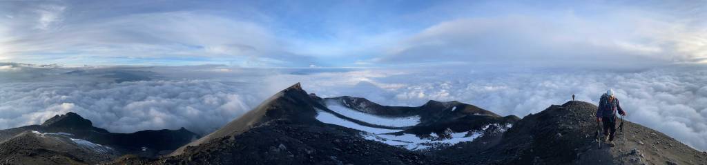 At this point we were directly under the crater rim and started to encounter “vents” that indicated this volcano was definitely active. We made sure to hike through the sulphur fumes as quickly as possible and entered some intermittent mists on the rim. Some climbers would call it “peak enough” at this point but that’s not an option for us. We either tag the true summit, or it’s a failed attempt. The ascent to the true summit was still relatively easy but involved some route-finding. The final summit ridge was incredibly scenic with sunshine and a sea of low clouds below us. Volcán El Altar and Volcán Chimborazo stole the show and we lingered on the summit for at least half an hour.