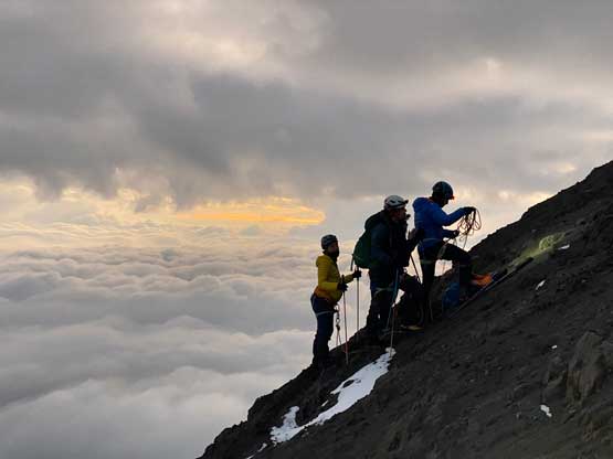 For this peak I opted to wear the trail-runners for the approach while carrying my Trango Tech mountaineering boots for the summit day. I knew the volcanic choss woud likely destroy the otherwise, brand new boots but I also didn’t want to haul the heavy ass 6000M boots for this ascent. About half an hour after starting we were above the treeline. The main “trail” was still easy to follow but there were already diversions here and there. Francisco seemed to know the route well so we just followed his lead. At around 4300 m elevation Francisco made us to don helmets even though this ascent was at most “class 2”. At around 4600 m we caught up to the Ecuadorian team and started passing them. Meanwhile the horizon was brightening up so that by the time we passed that entire team we no longer needed the head-lamps. The other team was short-roping the class 2 scrambling section. Francisco didn’t even bring a rope for us which I was glad. The terrain would be too “easy” to consider roping-up for Adam and I but we could see some of them were definitely struggling. This was shaping up to be an incredibly beautiful day despite the iffy weather forecast.
