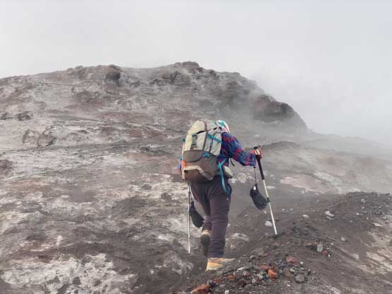 At this point we were directly under the crater rim and started to encounter “vents” that indicated this volcano was definitely active. We made sure to hike through the sulphur fumes as quickly as possible and entered some intermittent mists on the rim. Some climbers would call it “peak enough” at this point but that’s not an option for us. We either tag the true summit, or it’s a failed attempt. The ascent to the true summit was still relatively easy but involved some route-finding. The final summit ridge was incredibly scenic with sunshine and a sea of low clouds below us. Volcán El Altar and Volcán Chimborazo stole the show and we lingered on the summit for at least half an hour.