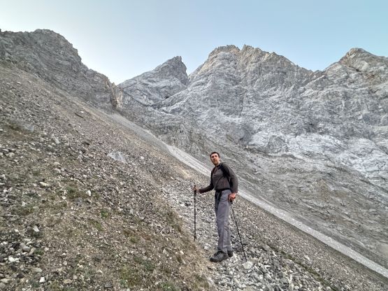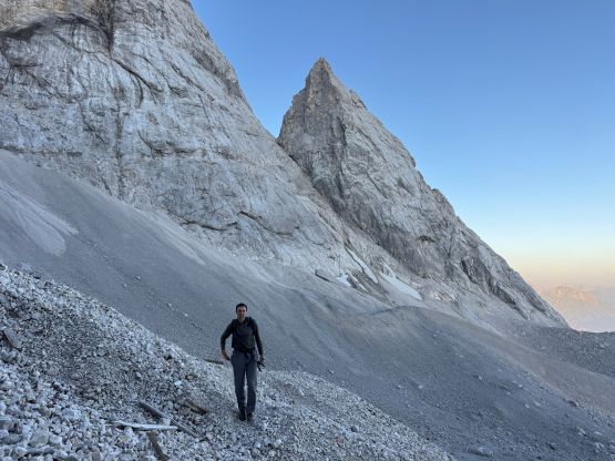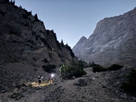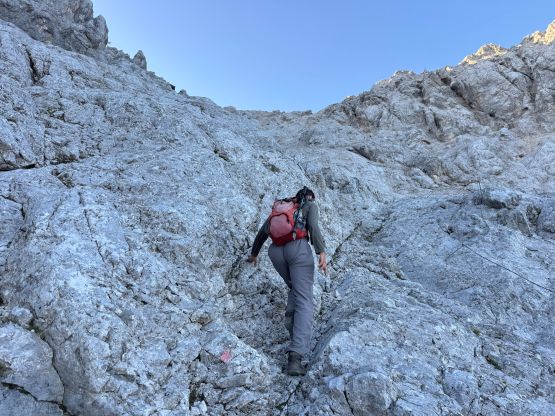Vlad and I started the long ass plod under a bright full moon and the first stretch was a tiring slog up a gated gravel road. About 10 minutes into the trip we merged onto the trail and followed it into the “lower basin”. It was still pitch dark but the full moon made it possible for us to see the terrain around. This area is absolutely rugged. The other early bird hikers were all fairly fast but Vlad and I were slightly quicker. For a long while we were alternating the lead with a young local couple, but we eventually pulled ahead of them on the narrow traverse towards the upper basin. The morning horizon was quite impressive so we also stopped regularly for photos. Our only major break/rest stop was at Wiener-Newstädter Hütte at 2230 m elevation. We didn’t even bother to go into the hut, but rather sit on the bench outside. I was getting cold very quickly so we only stopped briefly for food and water.