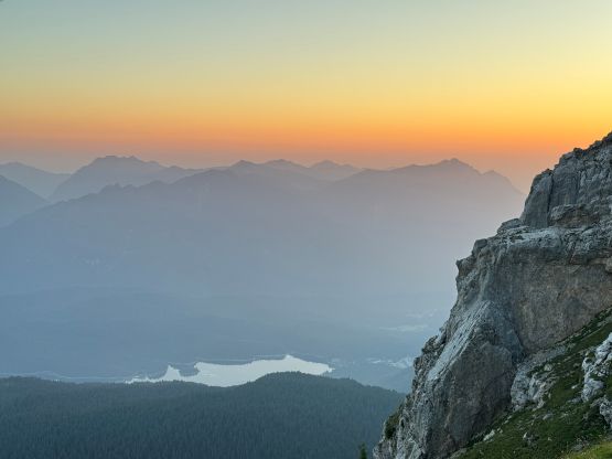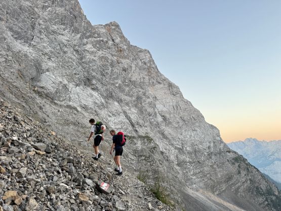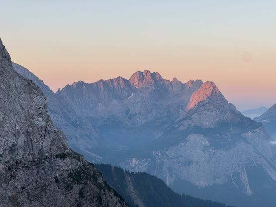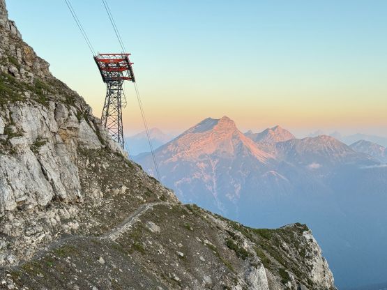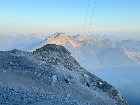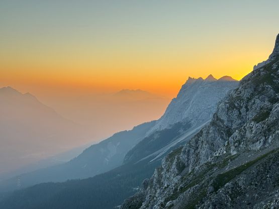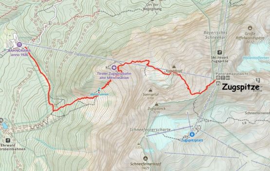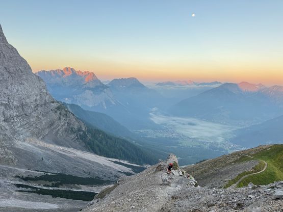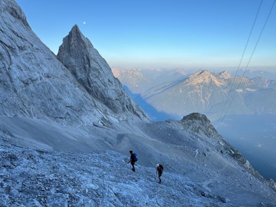 Zugspitze is an “ultra prominent peak” but is more known as the highest peak in Germany. The summit is shared between Germany and Austria and there are about a dozen routes on both sides of the border. It seems to me that the most famous route is the “full ascent” of 2300 m elevation profile from the NE but there exists shorter options. Vlad happened to be in the vicinity when Adam and I were peak-bagging in Innsbruck area by pure coincidence, and we altered the itinerary slightly so that we could share at least one day together. The objective was chosen to be Zugspitze. Adam needed a “rest day” so he would take the tramway to (near) the summit and then down, whereas Vlad and I would hike up from the valley bottom. I wasn’t keen on the Germany route so Vlad did the research and picked the west side Austrian ferrata route, which is also known as “Stopselzieher” or the “Cork Screw”. This would still require more than 1700 m elevation gain but is the shortest option without taking one of the two tramways.