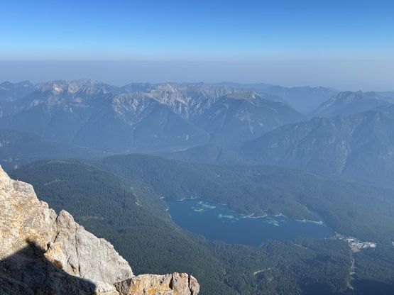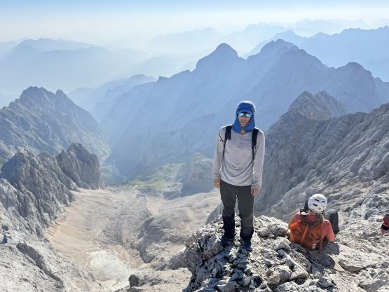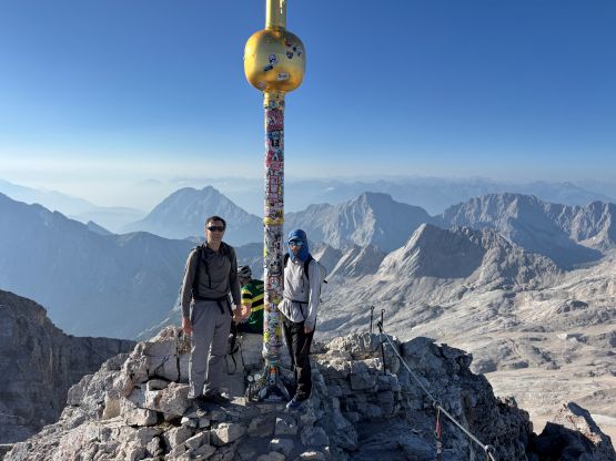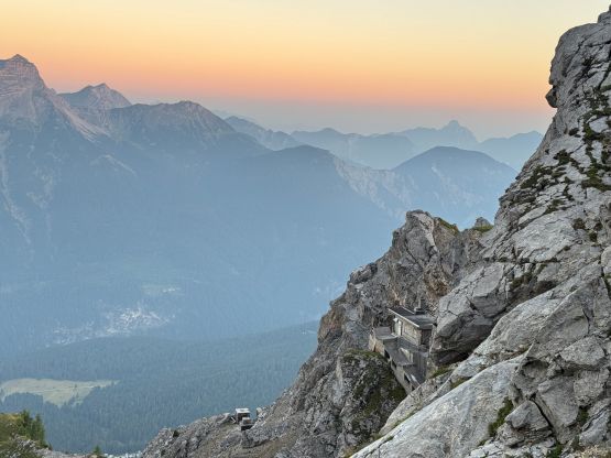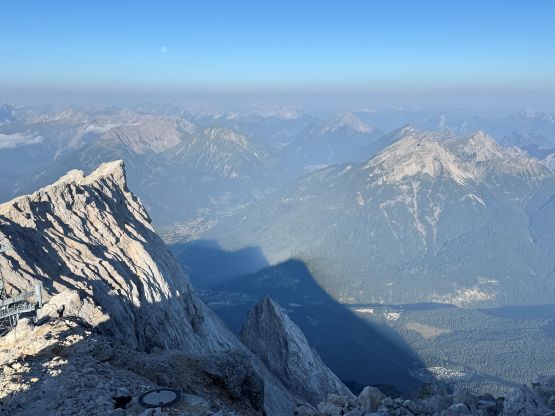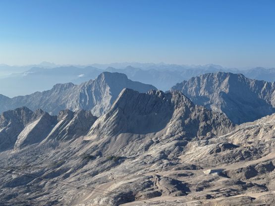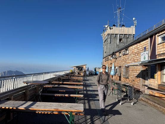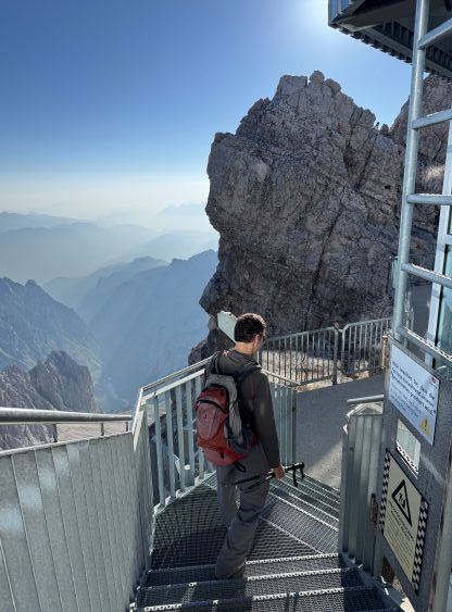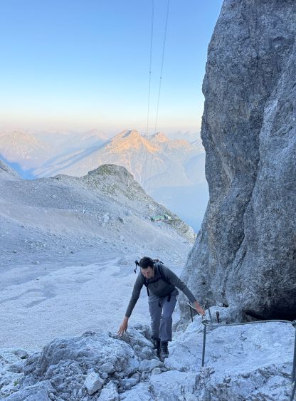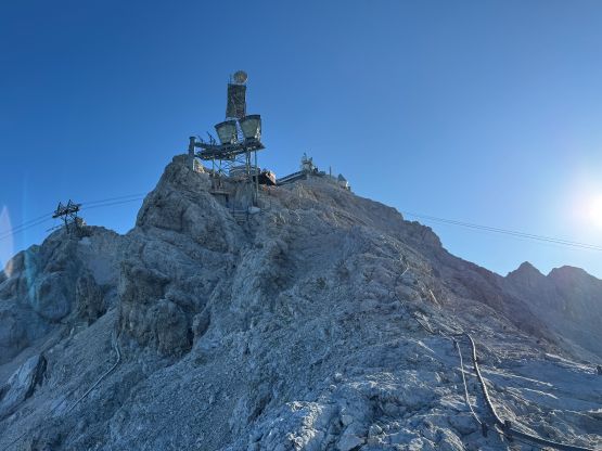 The ferrata climb out of this “upper basin” appeared rather daunting but we knew it was only graded A/B so there’s nothing to worry about. The slog to the start of the ferrata had some loose scree and the start was by going through some tunnel features. The scrambling was “class 3” at the most but without the artificial aids this would probably be a 5th class climb. I was trying hard to not use the metal hand/foot holds but I could not manage that entirely. There’s at least one short stretch of fairly sustained ferrata climbing. Higher up the terrain was mostly class 2 so we took the trekking poles out again and began the tiring slog. I did not enjoy the upper route as it’s mostly just plodding on loose terrain. Eventually we reached the crest of the SW Ridge, donned some sun protection but still had a ways to go. The worst route-finding was inside the summit building. There are at least 4 floors and I had absolutely no clue how to get out of the building to access the true summit ferrata/scramble. We ended up walking all the way downstairs and then back up, wasting probably 50 m elevation gain. Eventually after a shit ton amount of 4-letter words we gave up on ourselves and asked the folks out on the viewing platform who had harnesses on, and they gave us the correct direction. It was actually quite trivial and even had sign of “summit”, so this was not a trespass after all. The true summit scramble did not live up to the hype because it was very short and easy. We did have to be careful about the polished holds but that’s it. We were on top of Germany in 3.5 hours, successfully beating both the Germany and Austrian tramways.