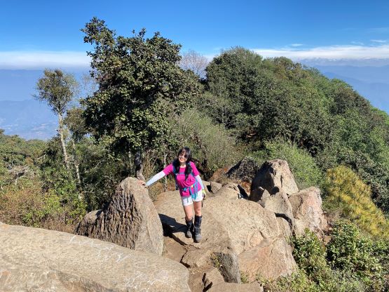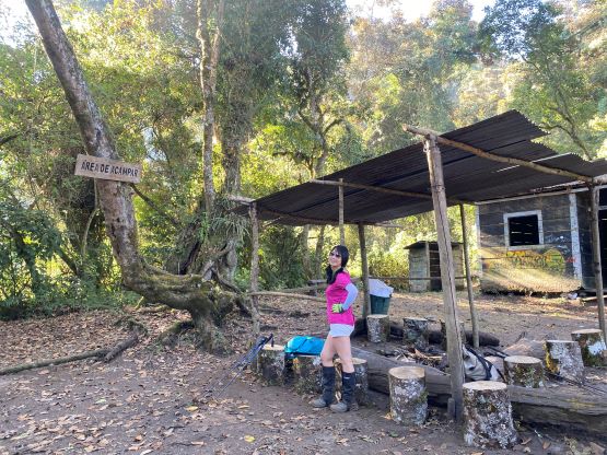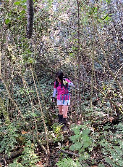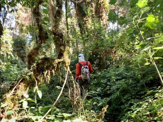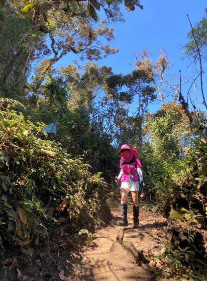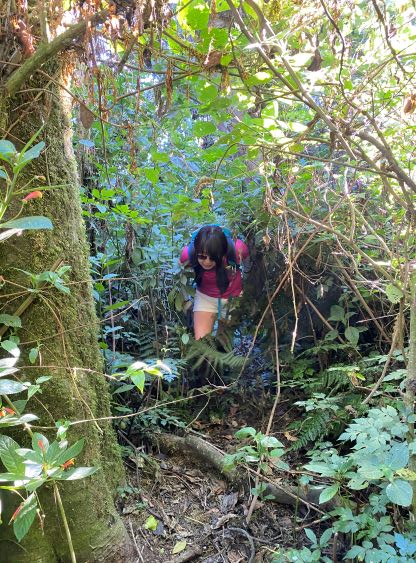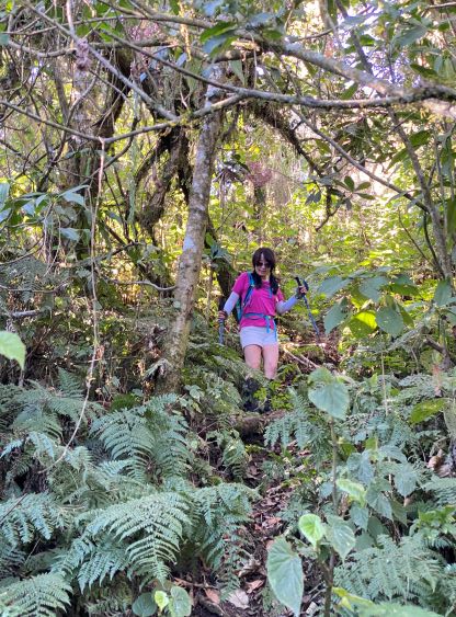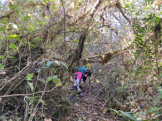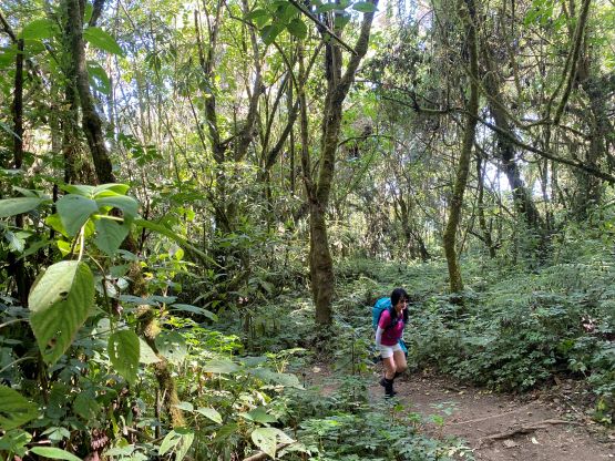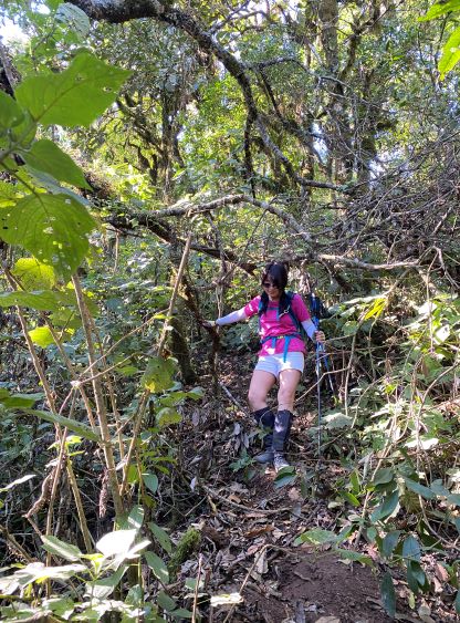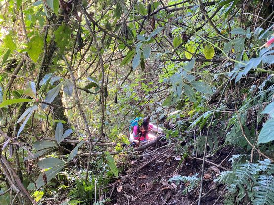 The next thousand meters of elevation gain was very boring but this trail had been well engineered. I could sense why they wanted to change an entrance fee as this was definitely the most developed trail that we had seen in this country so far. We passed a few stations with “lookout” structures but we refused to waste time there. I knew the best views would be on the final lookout/viewpoint or the east rim of the summit area. Kate and I again, did the entire push from the trail-head (1800 m) to the camping area at 2860 m without stopping, but upon reaching the camp site we had to take a break. Kate was extremely hungry and tired whereas I needed to don the long pants and gloves for the bushwhacking ahead. Of those who logged Volcán San Pedro on peakbagger.com I bet no more than 20% actually went to the true summit. I had downloaded Sam Grant’s GPX track and read a bunch of the reports, and I came here expecting an “on trail bushwhack” similar to what I had done in Indonesia last year. The truth was much more relaxed, that even though we did have to some bushwhacking the commitment was rather tame. This was more of an “unofficial trail” to me. We did not encounter anything thorny despite the warnings by the others. Kate managed this entire section in shorts (she did not bring long pants) and did not complain, and that says something. The true summit was viewless as expected, so we took some victory photos and went down.