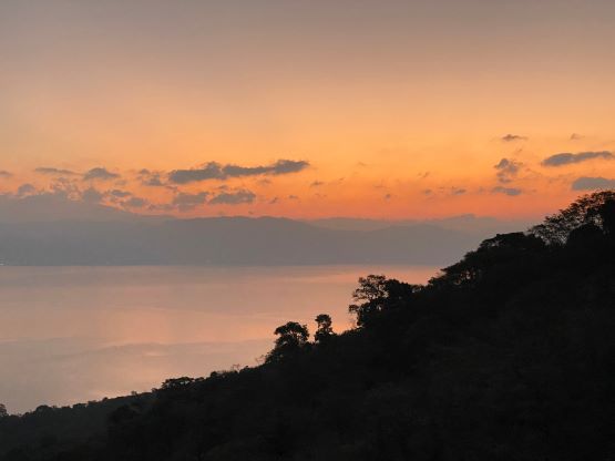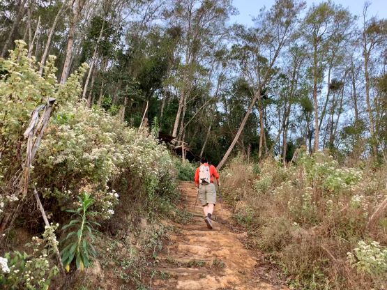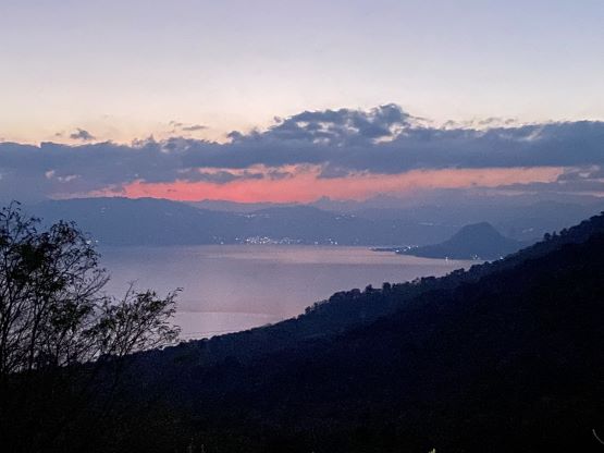 Oswaldo showed up at 5 am in front of our hotel in Santiago Atitlán and we spent roughly 40 minutes driving around the volcano to the trail-head near San Pedro la Laguna. The trail-head registration office had not opened yet, which meant we wouldn’t need to pay that ridiculous 100Q per person entrance fee, for now. We had to start hiking with head-lamps on, and the crux was within the first few hundred meters. Including the trail-head we met quite a few aggressive dogs barking as if they’d come to tear us into pieces in no time, that I was forced to lead us into the bushes on the upslope side. We bushwhacked 10-20 m higher than the trail/road away from what seemed like a private home, that despite the non-stop barking the dogs did not come to bite us. The bushwhacking lasted for about 15 minutes and by the time we finally got back on the trail much higher than the house we could still hear the barking from behind. I wondered what to expect on the return, but I made myself to not worry about that until a few hours later. From now onward the biggest risk would be getting robbed, and I told Kate that if we hear any sound made by human beings we should tuck the iPhones under our waist belt. Those old iPhones were still overall the most expensive items that we carried.
