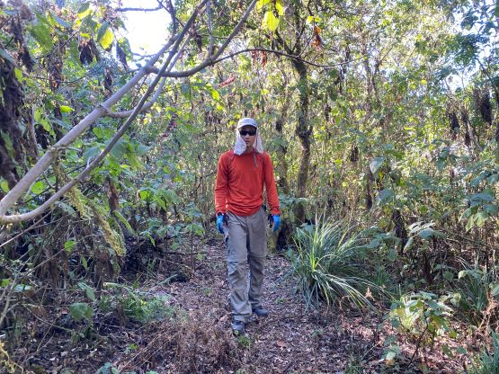 The next thousand meters of elevation gain was very boring but this trail had been well engineered. I could sense why they wanted to change an entrance fee as this was definitely the most developed trail that we had seen in this country so far. We passed a few stations with “lookout” structures but we refused to waste time there. I knew the best views would be on the final lookout/viewpoint or the east rim of the summit area. Kate and I again, did the entire push from the trail-head (1800 m) to the camping area at 2860 m without stopping, but upon reaching the camp site we had to take a break. Kate was extremely hungry and tired whereas I needed to don the long pants and gloves for the bushwhacking ahead. Of those who logged Volcán San Pedro on peakbagger.com I bet no more than 20% actually went to the true summit. I had downloaded Sam Grant’s GPX track and read a bunch of the reports, and I came here expecting an “on trail bushwhack” similar to what I had done in Indonesia last year. The truth was much more relaxed, that even though we did have to some bushwhacking the commitment was rather tame. This was more of an “unofficial trail” to me. We did not encounter anything thorny despite the warnings by the others. Kate managed this entire section in shorts (she did not bring long pants) and did not complain, and that says something. The true summit was viewless as expected, so we took some victory photos and went down.