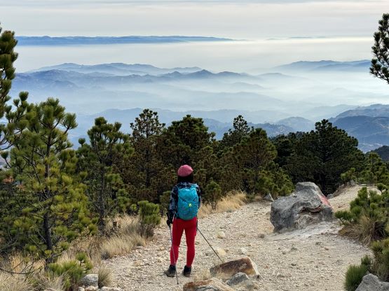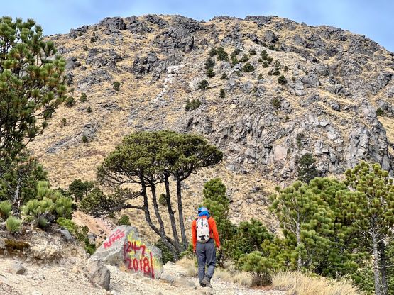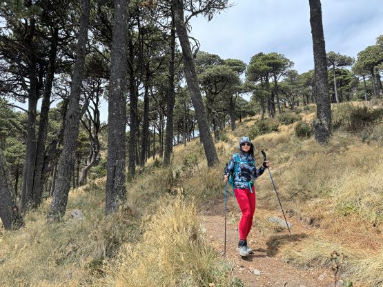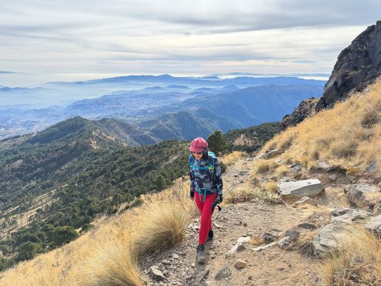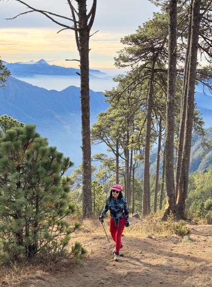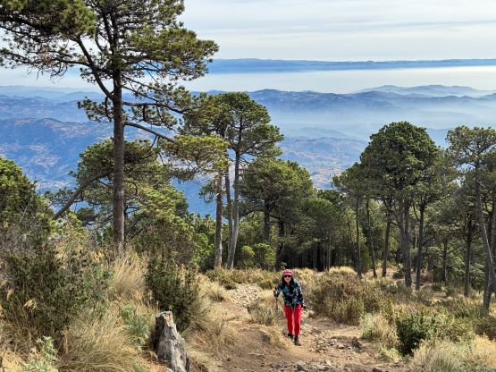 Kate plodding with Volcán Tacaná behind, our previous objective