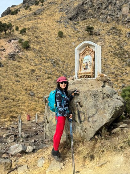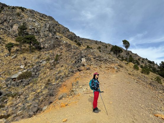 Kate posing at the trail-head with Volcán Santa María in the far background