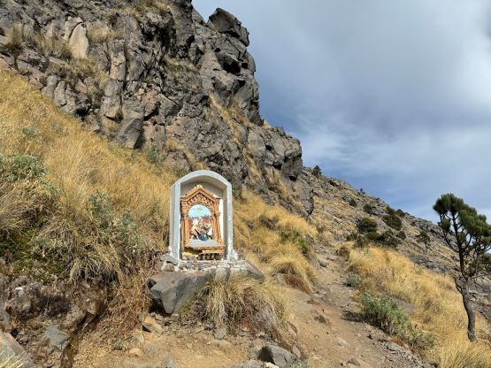 I did not bother to look hard for the trail-head because I spotted an eroded zone that resembled a path. After struggling to gain purchases up a loose chute above the road I quickly realized that this wasn’t the actual trail. We had to deal with some light bushwhacking but eventually joined the trail to the left after gaining 50 m elevation. This trail, though steep, dispatched elevation rather quickly and joined the standard route at above 3800 m elevation on the NE Ridge. Not far beyond that we reached the split where the path to the campground and Cerro Concepción diverged to the left. We took the right side branch which quickly led us to the scrambling section on the east side of Tajumulco where a bunch of religious plaques were erected. The final 200 m ascent to the summit was very scenic, but felt like a drag probably due to the higher altitude. Thankfully the views were rather excellent.