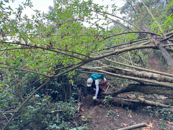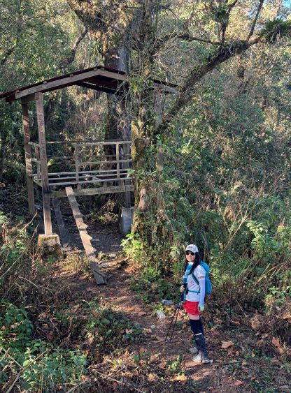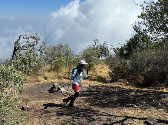It turned out that the 2 or 3 km to the 2930-m saddle joining the standard route was entirely on the remnant of this road, but only the first kilometer or so could have been driven. The rest of the road had disintegrated that one would need an ATV or a dirt bike to negotiate. There were unfortunately a shit ton of garbage and that had attracted a lot of flies that quickly became annoying. I also worried about the safety issues as this “road” was more like a trash dump, but I doubted if we would end up seeing anyone here. The road had narrowed down to a singletrack trail not far after joining the standard route and the trail to the Zunil/Santo Tomás saddle was quite undulating. Not doing much lingering at the saddle we turned left. The trail to Volcán Zunil was mostly well-engineered except for one steep and sandy section that required caution. The grade gradually eased off and we were eventually traversing 1-2 km of flat ground across the north slopes of our objective. I took a break while waiting for Kate to catch up, and meanwhile encountered a large group descending after spending the night on the summit. That turned out to be the only human being we saw on this outing. The trail brought us to the east side of the summit block and the final attack was a bit steep but uneventful. There had been some thick cloud coverages but the summit was tall enough to poke above the clouds, granting some views.