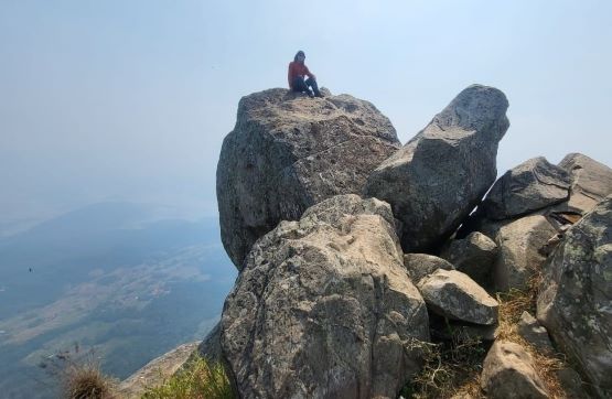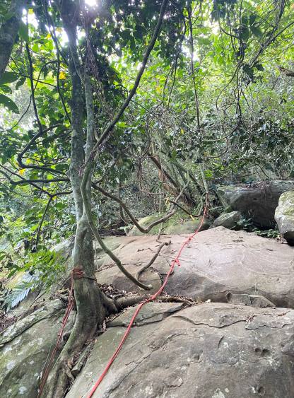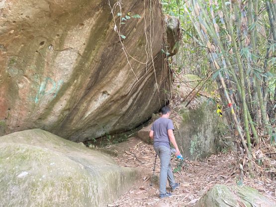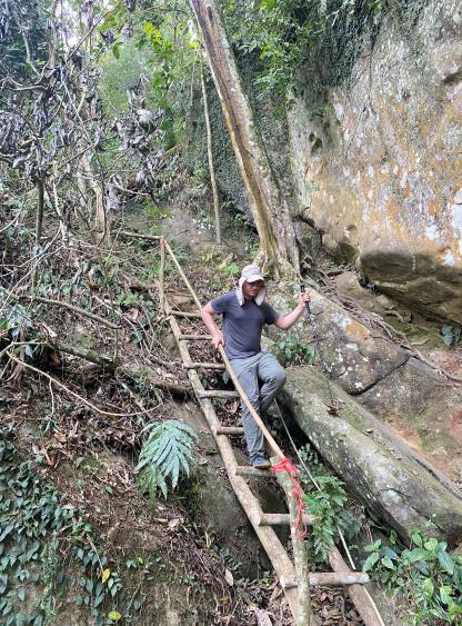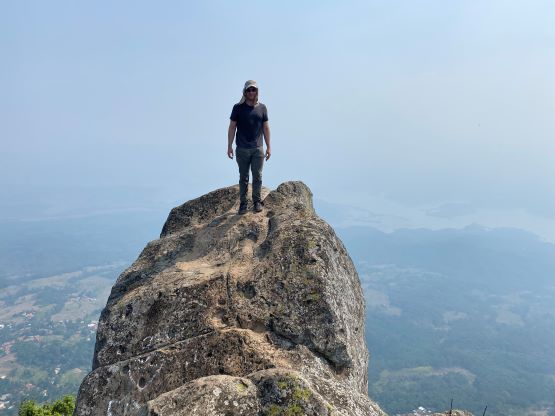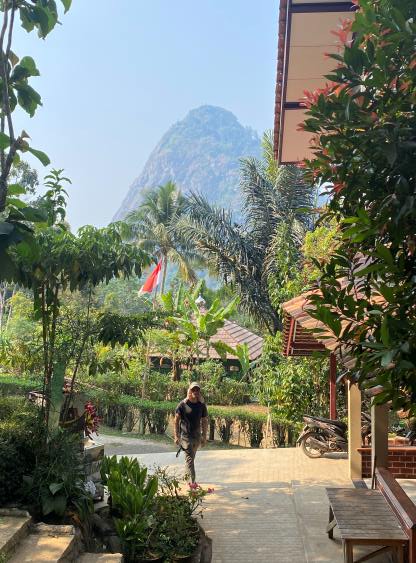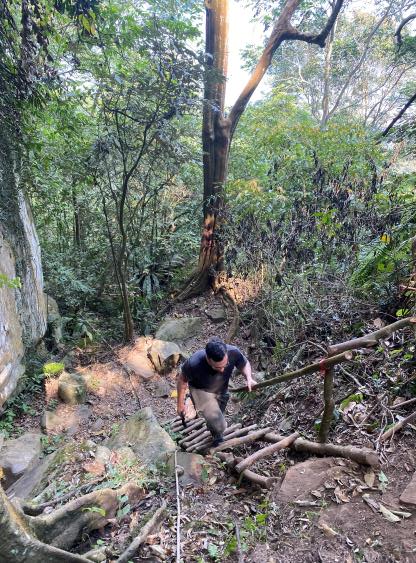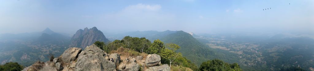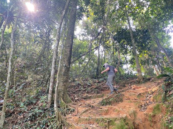 We only had about 350 m elevation gain over 1 km distance to reach the summit, so I anticipated a “giver”. This turned out to be more involved than I thought, but it’s still an easy ascent after all. Adam opted to not even bring his backpack. The crux of this ascent was the heat, as we were now in the afternoon and the elevation of this mountain is under 1000 m. We were both drenched from the sweats but thankfully at least half of the route was in the shades. There were also enough varieties to keep us entertained, and the route felt more like in Squamish than in Indonesia. The true summit of Gn. Bongkok is a short 3rd class scramble on a large boulder and was very fun. The view towards Gn. Parang is extremely impressive and we soon learnt that most, if not all climbers including the via-ferrata climbers do not ascend the true summit of that peak. The true summit might actually be a dauntingly difficult climb that does not have much “beta” available. Our driver knows a direct (not the easiest) route but it’s apparently a 5.11 climb.