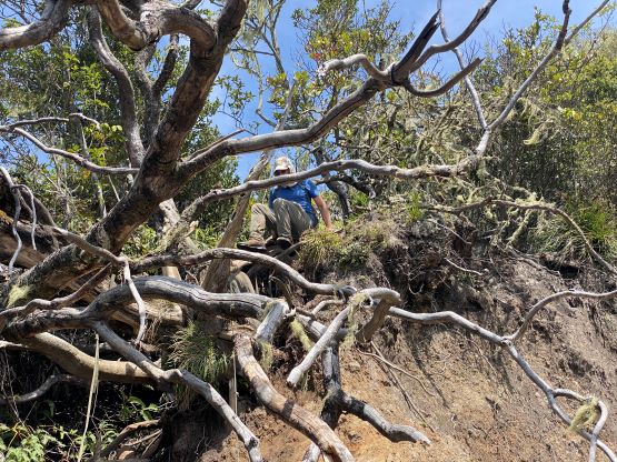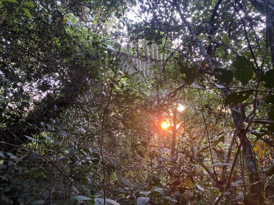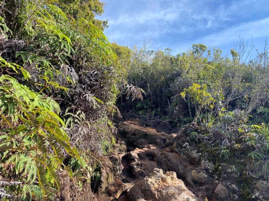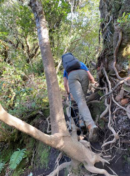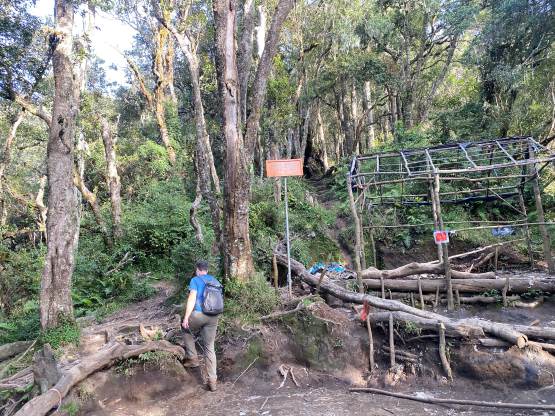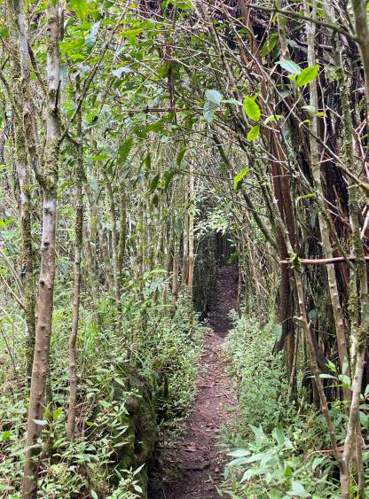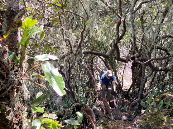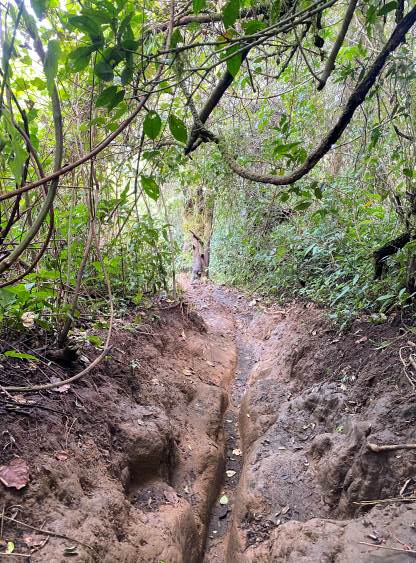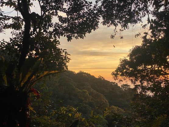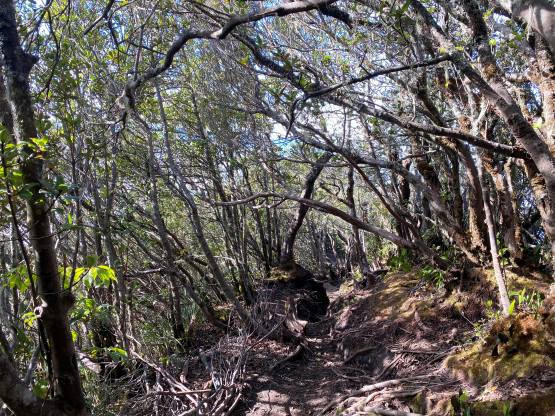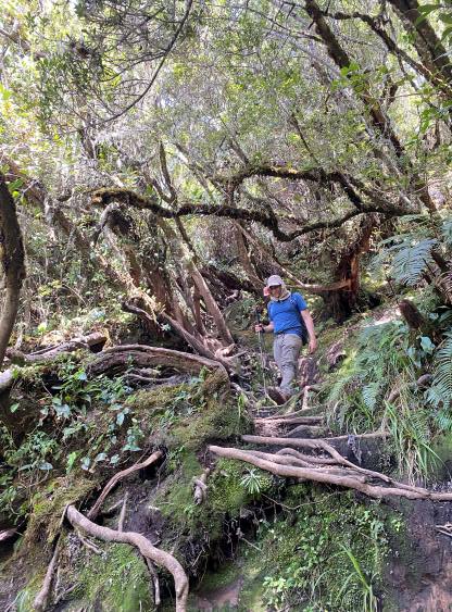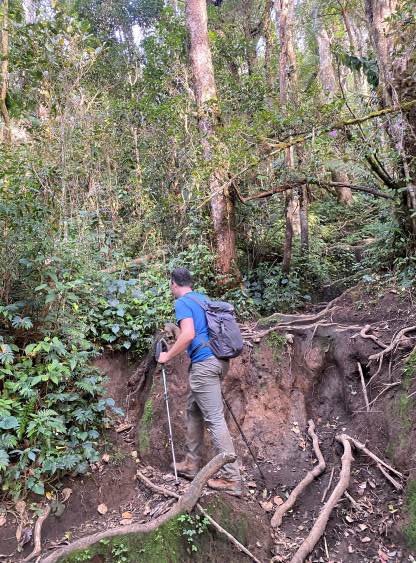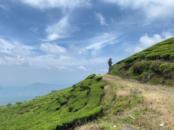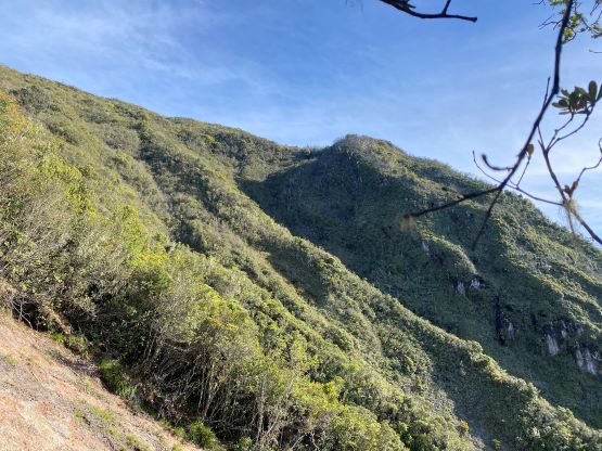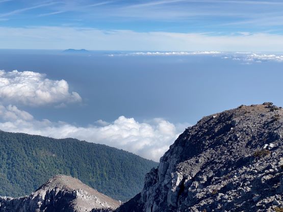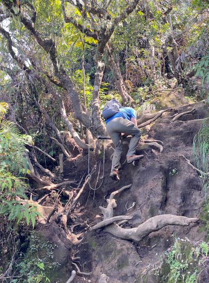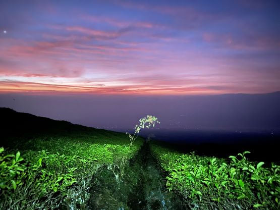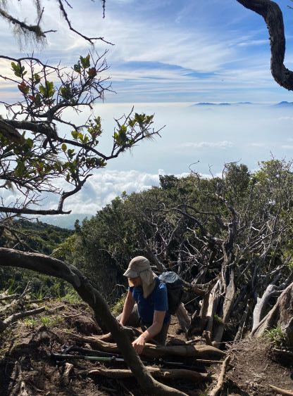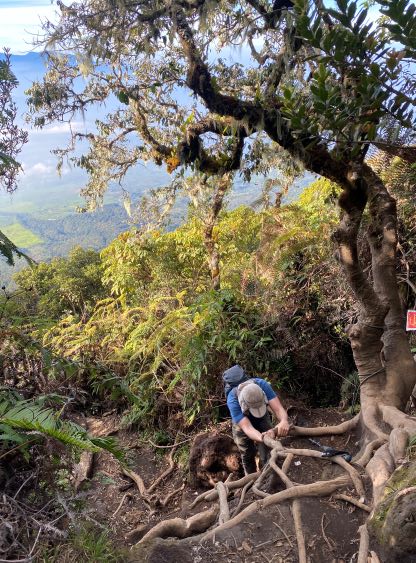 The actual ascent was a piece of cake compared to what we needed to do prior to the ascent. The driver dropped us off at the end of the pavement at 5 am and in short time we hiked up through the tea plants into the jungle. This was nowhere like in West Sumatra, that the trail was mostly wide and dry, and there was no leech to be seen. The hike was quite physically demanding though with about 1600 m cumulative elevation gain on mostly jungle roots. After about halfway up to the false summit the trail became insanely steep that we were constantly scrambling on the roots and mud steps, that sometimes it felt like class 3. The views opened up briefly under the false summit and we could see Gn. Patah, the “broad ultra” behind us on the skyline.