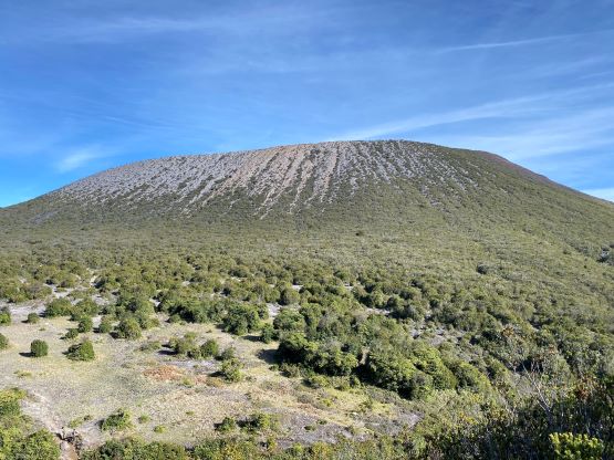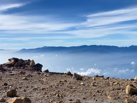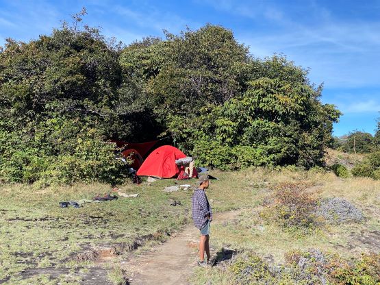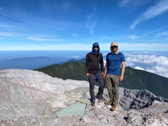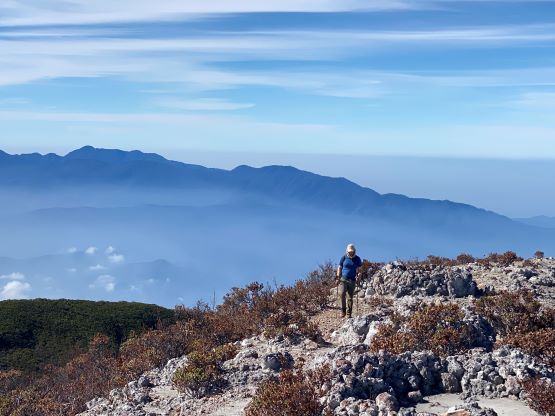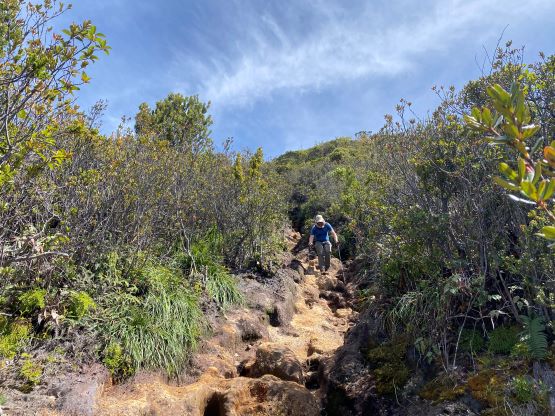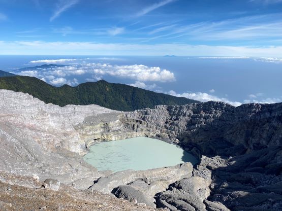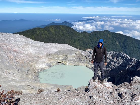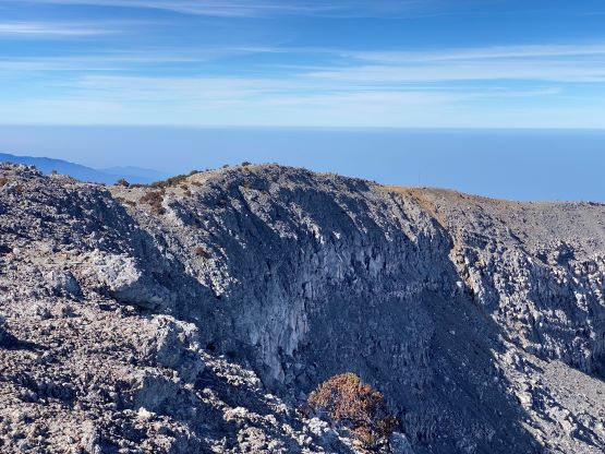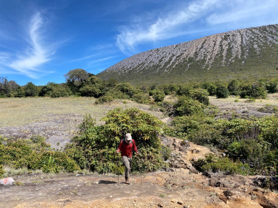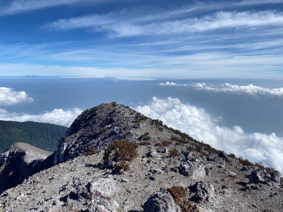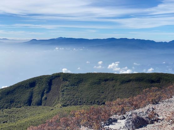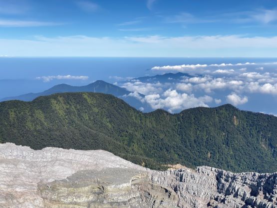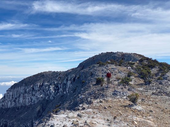 The false summit was completely forested so there’s no point in lingering there. The path brought us down to the broad camping area between the false and the true summits. Unfortunately there was a mandatory 50-m drop that must be regained on the descent. Plodding across this camping area was confusing as the paths weren’t obvious, but the paths converged in the end. The ascent onto the summit ridge was done in a dry gully with some loose rocks, but nothing worth noting. The true summit was about 500 m to the north and the traverse across the crater rim was incredibly scenic. I kept thinking about that massive explosion a few days ago, and I wondered if we could see one like that. The volcano was however, sleeping deadly and did not show any sign of activity while we were there.