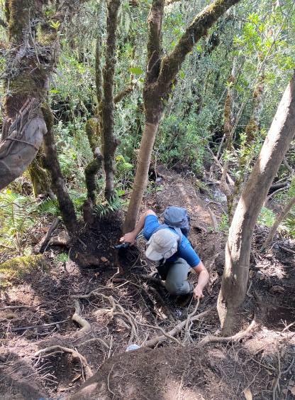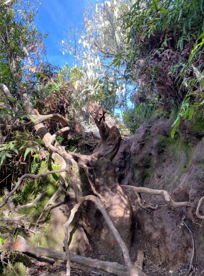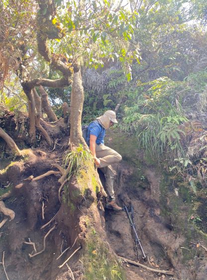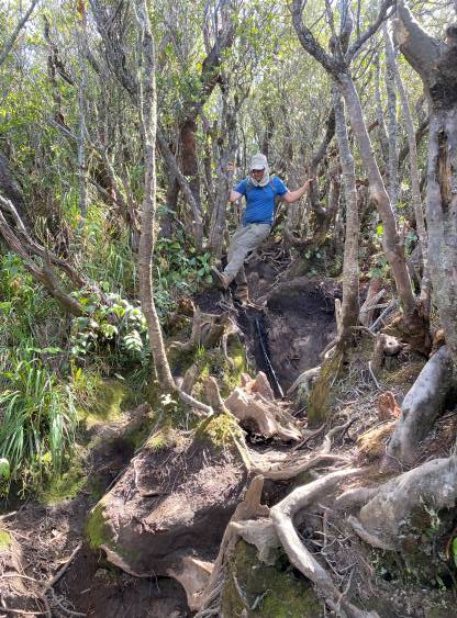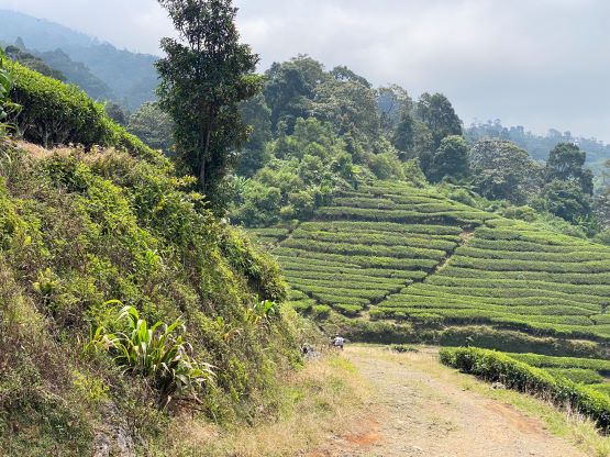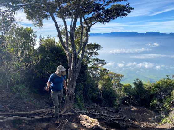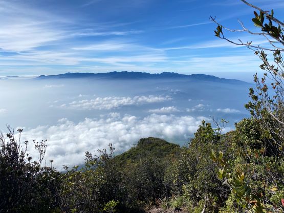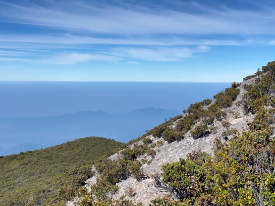 The actual ascent was a piece of cake compared to what we needed to do prior to the ascent. The driver dropped us off at the end of the pavement at 5 am and in short time we hiked up through the tea plants into the jungle. This was nowhere like in West Sumatra, that the trail was mostly wide and dry, and there was no leech to be seen. The hike was quite physically demanding though with about 1600 m cumulative elevation gain on mostly jungle roots. After about halfway up to the false summit the trail became insanely steep that we were constantly scrambling on the roots and mud steps, that sometimes it felt like class 3. The views opened up briefly under the false summit and we could see Gn. Patah, the “broad ultra” behind us on the skyline.