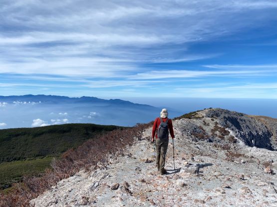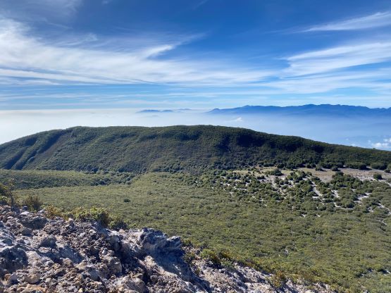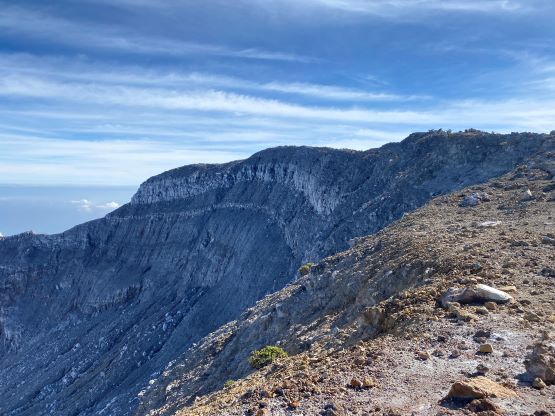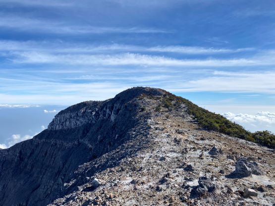 The false summit was completely forested so there’s no point in lingering there. The path brought us down to the broad camping area between the false and the true summits. Unfortunately there was a mandatory 50-m drop that must be regained on the descent. Plodding across this camping area was confusing as the paths weren’t obvious, but the paths converged in the end. The ascent onto the summit ridge was done in a dry gully with some loose rocks, but nothing worth noting. The true summit was about 500 m to the north and the traverse across the crater rim was incredibly scenic. I kept thinking about that massive explosion a few days ago, and I wondered if we could see one like that. The volcano was however, sleeping deadly and did not show any sign of activity while we were there.