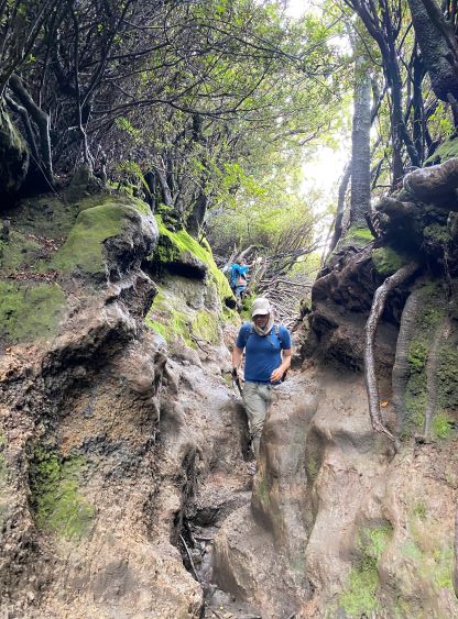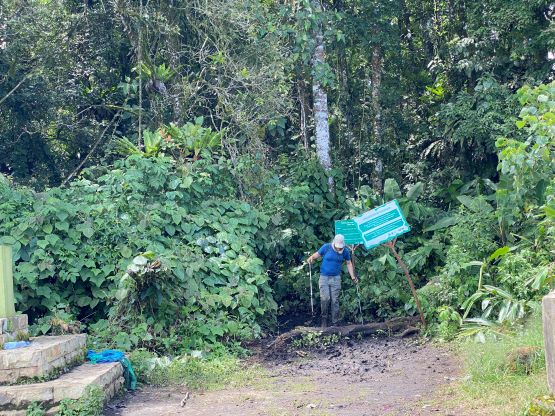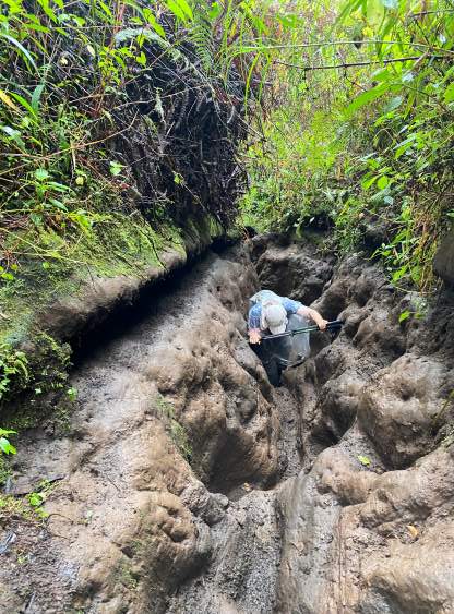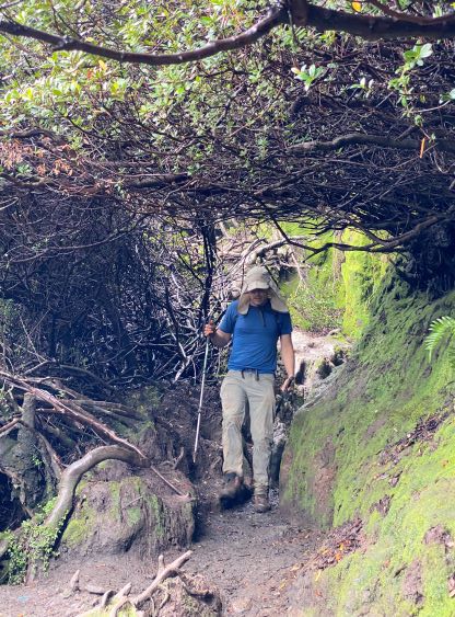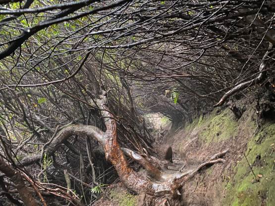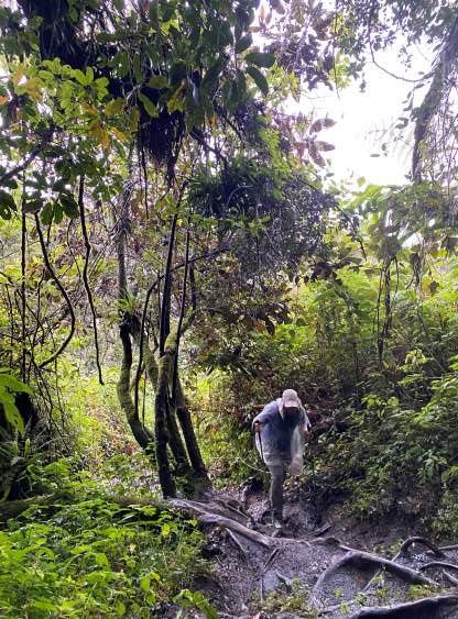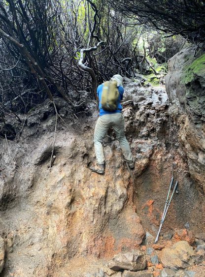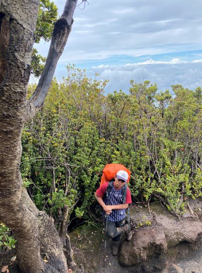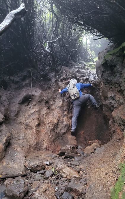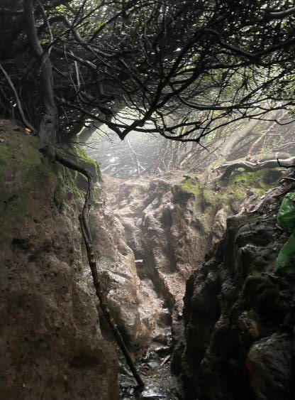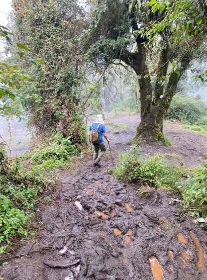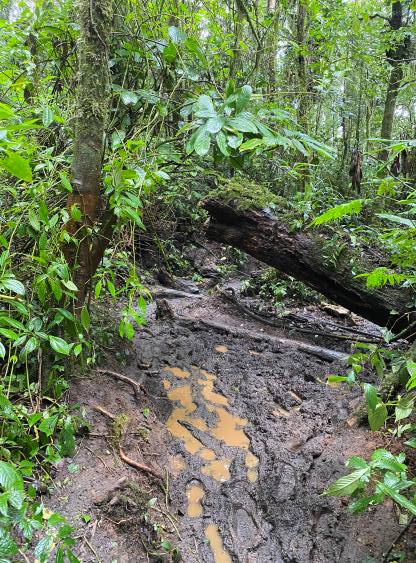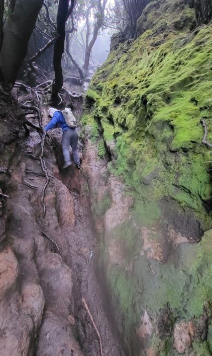 There were 500 m elevation gain between Shelters 1 and 2, so this section was quite long. The terrain had gradually become steeper and more technical, and 3rd class moves had started to become frequent. I thought this was actually quite fun, because I preferred hands-on scrambling over the numbing plodding. Shelter 2 was disappointing as there’s no “shelter” there, but thankfully the intensity of the rain had decreased. After a brief stop for food we carried on towards Shelter 3 at 3300 m elevation where we were supposed to spend the night at, and this section of the trail was the most technical. There were quite a few difficult spots and I took one fall by blowing a foothold. There’s no exposure so I didn’t check thoroughly, but this was the jungle mud steps that my mountaineering experience would come in no use anyway. It required consistent problem-solving. The rain made the jungle mud look, feel and taste like dirrahea.