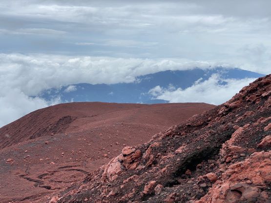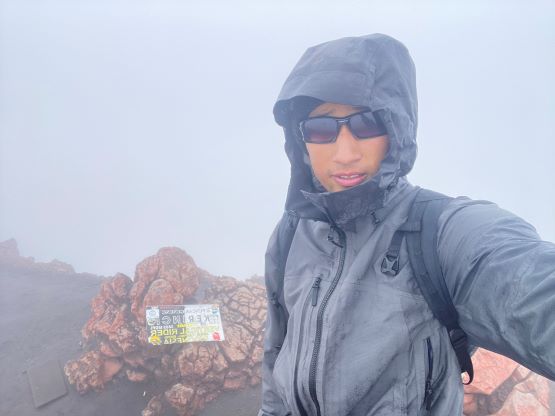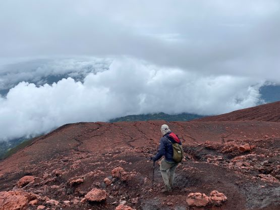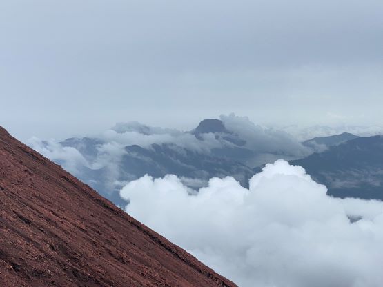 Shelter 3 marked the transition from jungle to the alpine zone, and was much bigger than the previous ones with at least 15-20 tents already pitched. The weather was misty, windy and drizzling so we went straight past the camp for the summit push. Most of the hikers were on their way down from the summit. The final 500 m elevation gain to the top was quite steep and loose, but not difficult. The weather briefly improved to reveal some views but the sky stayed grey. The sulphurous gases were extremely acidic on this mountain, that my eyes started to hurt after a few minutes. I quickly donned the sunglasses even though the light wasn’t intense enough to warrant the use of them. There were three locals following us to the summit and we celebrated the success together. The weather could become worse in this intermittent white-out with drizzling and my layers were definitely undertooled so we must descend immediately.