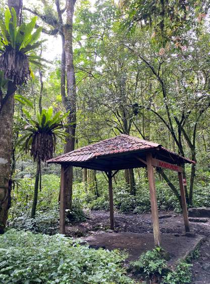 There was actually about 10 minutes of walking on the deactivated portion of this road to reach the actual trail-head. The registration was obviously not open at this time of the day, but Rapani had already done the registration for us anyway. The guide and the porter needed a break to take their jackets off whereas Adam and I started hiking in the cold and did not need that stop, so we took off from this point. There was about 2 hours of head-lamp time ahead, and the jungle was much worse than expected. The mud was continuous and non-stop right from the beginning. I thought the flat stretches were the worst as we had to post-hole at times. Once the grade picked up the going was actually easier as it then became a scrambling game. The mud made the terrain extremely slippery but I preferred that over post-holing. About 1 hour later it started to drizzle and the drizzle quickly became a steady rain. It never turned into downpouring but the rain was heavy enough to be annoying. The first camping area was the only one with a shelter, so we took our first break there, after gaining 700 m elevation. The head-lamps were no longer required, and I talked to some guides about the weather. The communication was difficult because of the language barrier but I did get one comment that “you are not in Java here”. It seemed like everyone at that camp was about to resume the plan, so the weather must be pretty tame for this area’s standard. Adam showed up a few minutes later in his poncho. I only brought one t-shirt and one hardshell. Wearing the hardshell would be too hot, but I couldn’t completely soak my only shirt, so my decision was to hike shirtless to at least Shelter 2, maybe even Shelter 3.