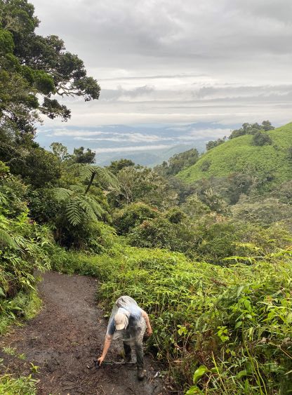 The descent was mostly about techniques and experience on the loose terrain so we made quick work down to Shelter 3. The weather was actually improving with more and more views showing up, but it was still drizzling. I needed a break for food as I hadn’t eaten much at all, and there’s no way I would carry that heavy ass box lunch up and down the mountain. The cold rice and chicken was not very tasty but I had to force myself to consume. I ended up eating all of the meat but dumped half of the rice. After at least half an hour at this camp the guide and the porter still didn’t show up, and I was getting quite cold. We made the spontaneous decision to descend, find the guide and the porter and camp at Shelter 1. It turned out that they were actually not that far behind, but there’s no way for us to go back up to Shelter 3 to camp. I then threw out the idea to descend all the way to the trail-head. It was only 11:30 am so why making a camp at that first site, from which the descent could be easily made in 1 hour. The guide was actually keen but the porter was too tired for that. There’s actually cell reception so called Rapani and made the final decision. The guide would follow us to the trail-head, whereas the porter would climb up to Shelter 3 to spend the night.