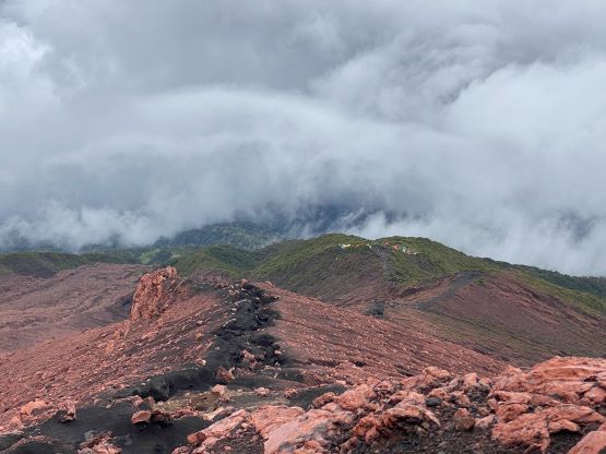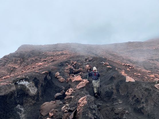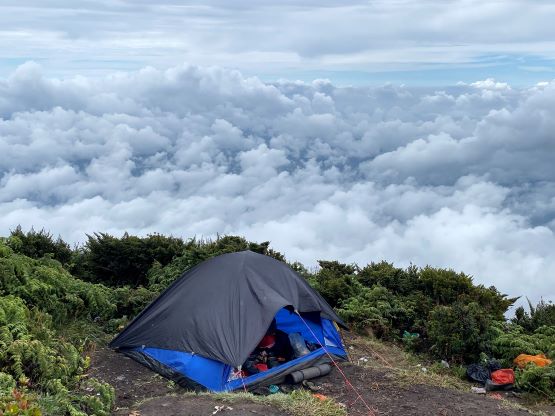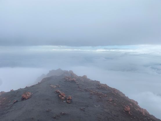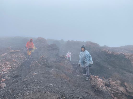 Shelter 3 marked the transition from jungle to the alpine zone, and was much bigger than the previous ones with at least 15-20 tents already pitched. The weather was misty, windy and drizzling so we went straight past the camp for the summit push. Most of the hikers were on their way down from the summit. The final 500 m elevation gain to the top was quite steep and loose, but not difficult. The weather briefly improved to reveal some views but the sky stayed grey. The sulphurous gases were extremely acidic on this mountain, that my eyes started to hurt after a few minutes. I quickly donned the sunglasses even though the light wasn’t intense enough to warrant the use of them. There were three locals following us to the summit and we celebrated the success together. The weather could become worse in this intermittent white-out with drizzling and my layers were definitely undertooled so we must descend immediately.