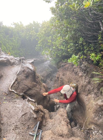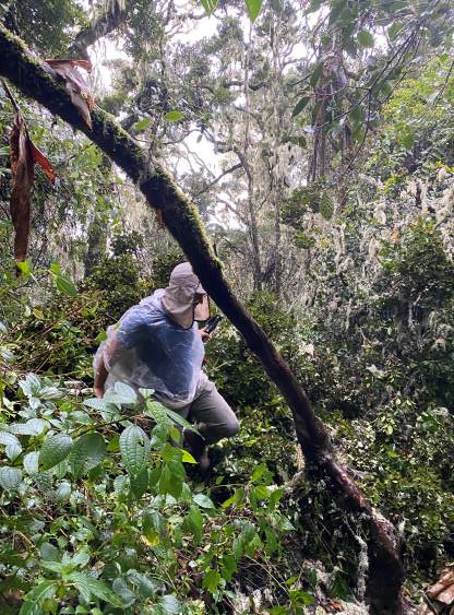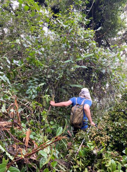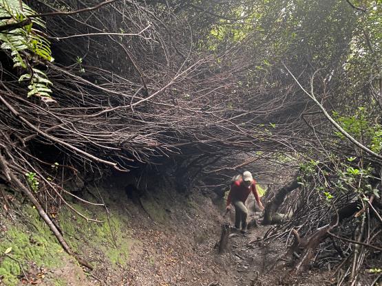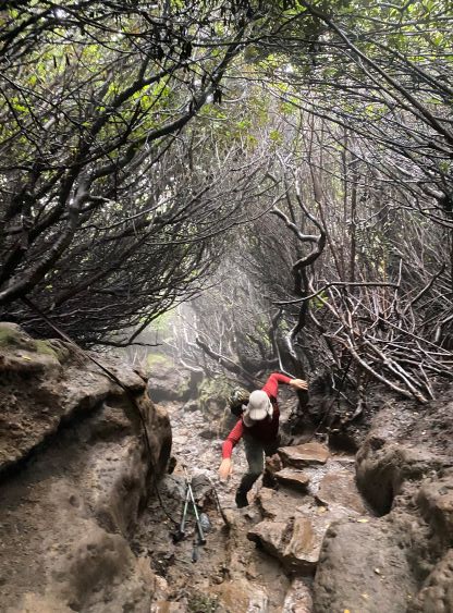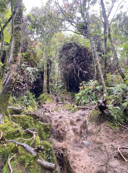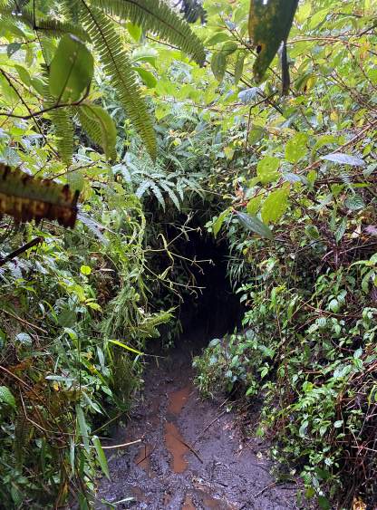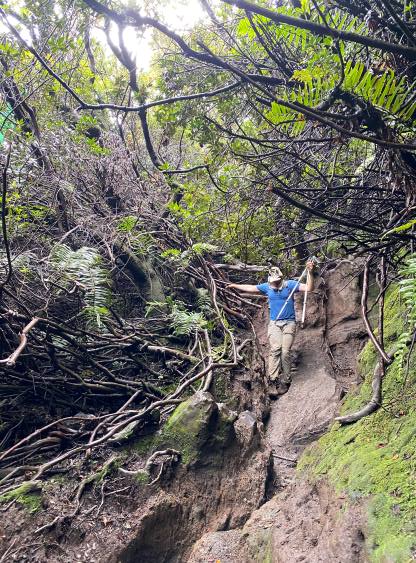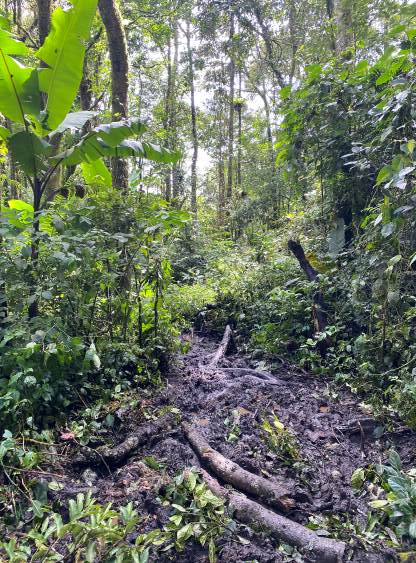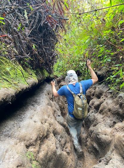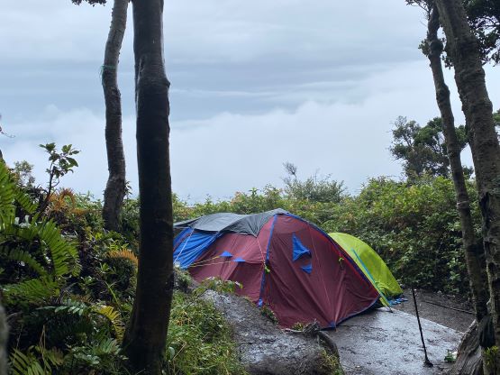 There were 500 m elevation gain between Shelters 1 and 2, so this section was quite long. The terrain had gradually become steeper and more technical, and 3rd class moves had started to become frequent. I thought this was actually quite fun, because I preferred hands-on scrambling over the numbing plodding. Shelter 2 was disappointing as there’s no “shelter” there, but thankfully the intensity of the rain had decreased. After a brief stop for food we carried on towards Shelter 3 at 3300 m elevation where we were supposed to spend the night at, and this section of the trail was the most technical. There were quite a few difficult spots and I took one fall by blowing a foothold. There’s no exposure so I didn’t check thoroughly, but this was the jungle mud steps that my mountaineering experience would come in no use anyway. It required consistent problem-solving. The rain made the jungle mud look, feel and taste like dirrahea.