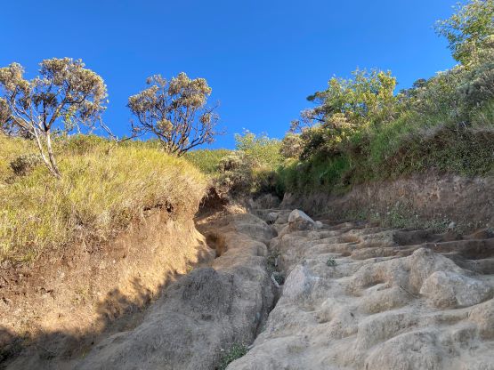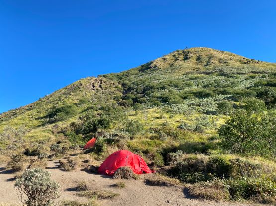 This hike was shorter than I thought with only 1300 m elevation gain required, but the terrain and the trail was not as nice as some of the ones we just did recently. This peak was the dustiest I’ve done so far in Indonesia and the weather was very windy. The decision to leave the jackets behind (so no extra layer besides the t-shirt I was wearing) suddenly became questionable, but I ended up being able to generate enough heat by hiking fast. I also somehow forgot to bring sunscreen and sunglasses. Adam was actually relying on using my sunscreen so we together only had a tiny bit in his backpack, which was actually not the worst case. The sunglasses, though not critical in Indonesia, could serve as a shield from the dusts. Not having that shield meant I got a lot of ashes and sand crystals in my eyes and at times it was very difficult to see even the immediate ground ahead. The trail was mostly in the forest until Camp 2 and we entered the dusty zones after that. The wind only magnified the dust problems. The trail was also extremely steep and slippery for the few hundred vertical meters between the two highest camps, that I actually don’t think the averaged Indonesian hikers could handle the terrain. In fact, many sat on their asses to descend, as I observed a couple hours later.