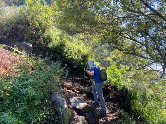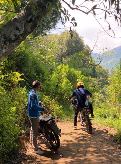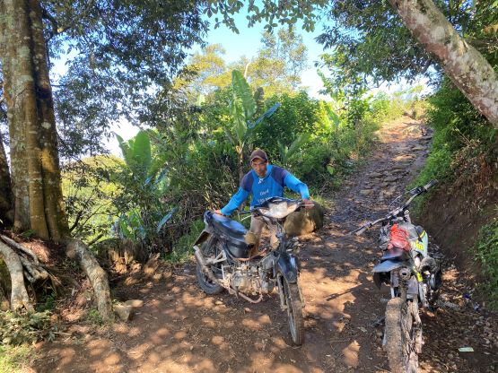 About 20 minutes later the two ojek riders showed up. They promised to drive us all the way to Pandu Pewayangan at 1350 m. I had some doubts but whether that’s true or not it’s shaping up to become a very short objective. The drivers were skillful but drove very fast, that both Adam and I were glad that this wasn’t our first ride in this trip. The trail was steep, narrow and exposed with many places where a fall could be fatal. They indeed got us to 1350 m where the trail ahead was clearly not built for ojeks anymore. With only 250 m elevation gain left we told them to pick us up in one hour. The communication was difficult as none of them spoke any English. I wrote “11 AM” on my phone while pointing on the ground and they eventually figured out what I meant, somehow. I thought they’d be waiting at this spot for our return, but they wanted to drive down and then come back up.