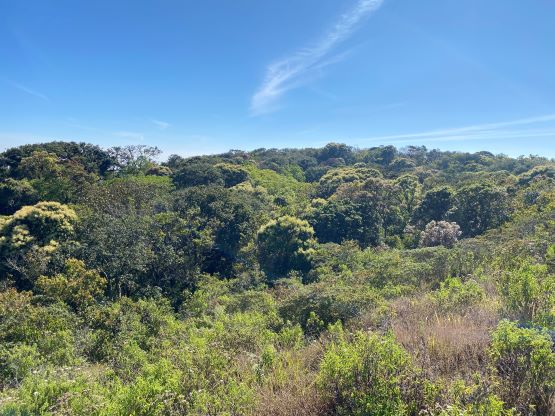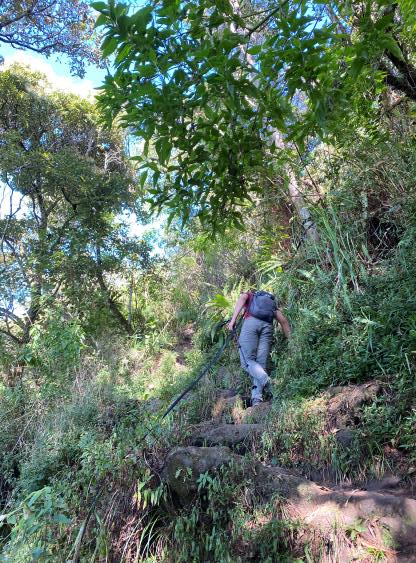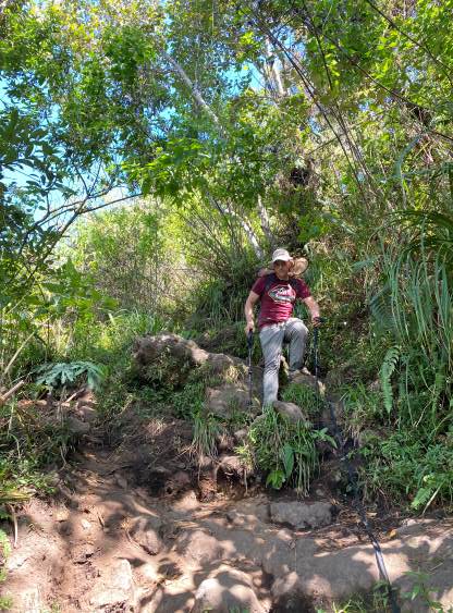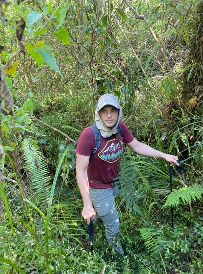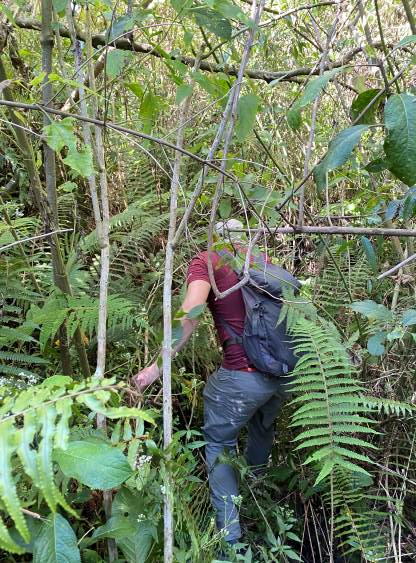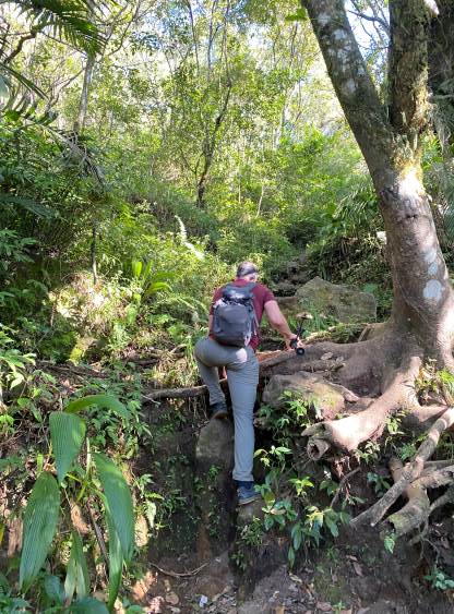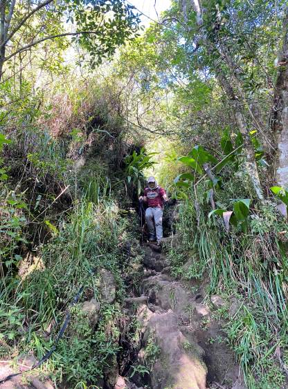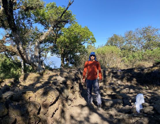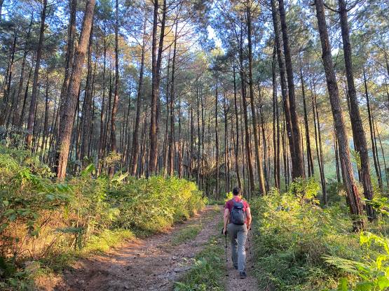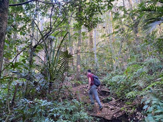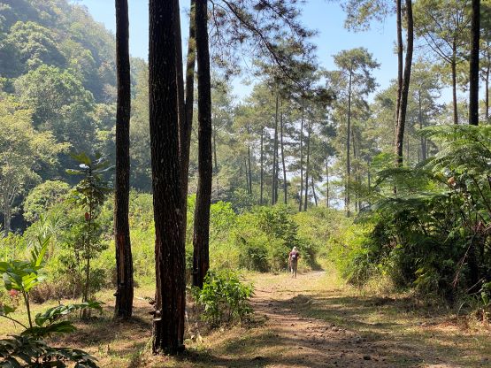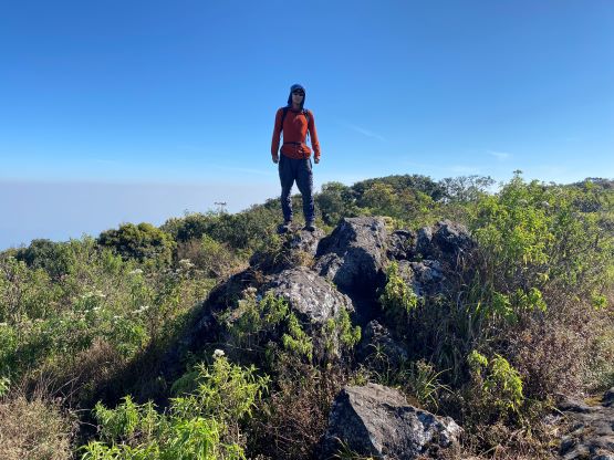 I did not bring a mask in this trip so we made sure to zip past this toxic zone at a fast pace. In a short while the trail brought us back onto the gravel road and we followed this gravel road for at least 1-2 km into the forest. The grade had been mostly gradual. Beyond one of the lower “pos” the road gave way to a proper trail. We thought the trail quality was amazing because we just came back from a week and half in Sumatra where we had to constantly deal with 3rd class scrambling on tree roots and mud steps. There was no mud in Java because it had not rained for two months. We did not start “scrambling” until the uppermost 200 m but even so, the difficulty was much easier than those peaks in Sumatra. Adam did hit his head on a tree and subsequently got bitten by a leech. I think we both let our guard down given the overall easiness of the terrain. The trail brought us to a large viewpoint which was one of the few contenders of the true summit. The trail kept going further, so we dived back into the woods and found another contender at the end of the path. There’s one more contour line on our topo maps, so we also thrashed a short ways eastwards to check out the third contender. The bushwhacking was horrible so we stopped once reaching a spot that can be defined as a “local maximum” in calculus. The conclusion was not decisive because the summit area is large, flat and forested but I think we could safely claim this peak. Most hikers would stop at the first viewpoint and call it good enough.