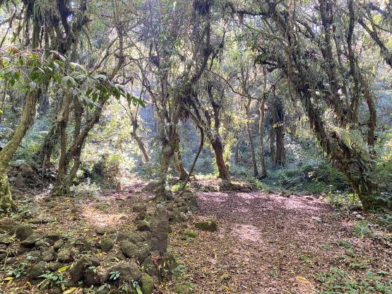 I did not bring a mask in this trip so we made sure to zip past this toxic zone at a fast pace. In a short while the trail brought us back onto the gravel road and we followed this gravel road for at least 1-2 km into the forest. The grade had been mostly gradual. Beyond one of the lower “pos” the road gave way to a proper trail. We thought the trail quality was amazing because we just came back from a week and half in Sumatra where we had to constantly deal with 3rd class scrambling on tree roots and mud steps. There was no mud in Java because it had not rained for two months. We did not start “scrambling” until the uppermost 200 m but even so, the difficulty was much easier than those peaks in Sumatra. Adam did hit his head on a tree and subsequently got bitten by a leech. I think we both let our guard down given the overall easiness of the terrain. The trail brought us to a large viewpoint which was one of the few contenders of the true summit. The trail kept going further, so we dived back into the woods and found another contender at the end of the path. There’s one more contour line on our topo maps, so we also thrashed a short ways eastwards to check out the third contender. The bushwhacking was horrible so we stopped once reaching a spot that can be defined as a “local maximum” in calculus. The conclusion was not decisive because the summit area is large, flat and forested but I think we could safely claim this peak. Most hikers would stop at the first viewpoint and call it good enough.