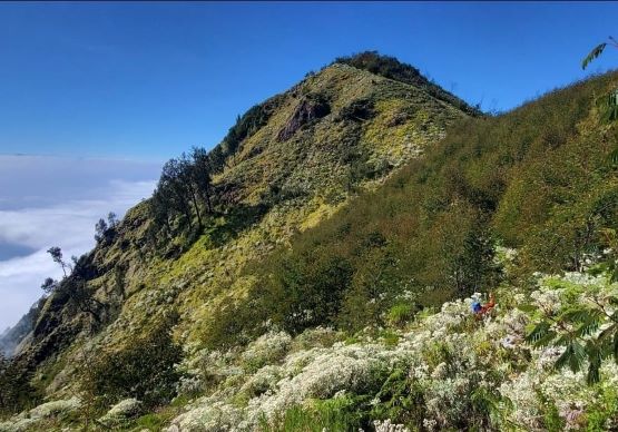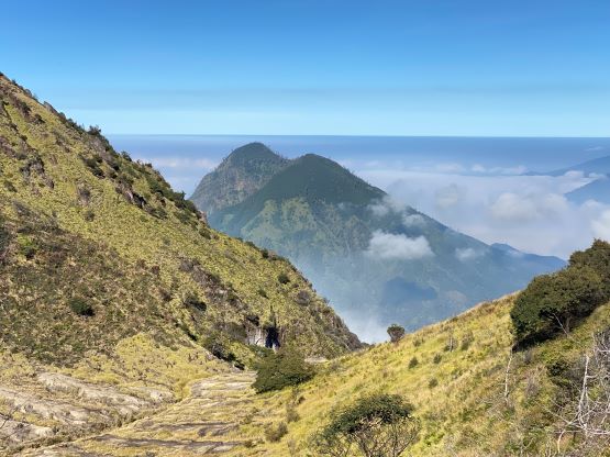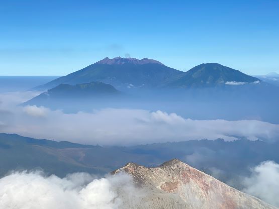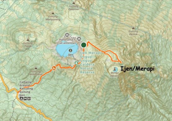 The Ijen volcano complex is a group of composite volcanoes with Gunung Merapi being the highest one, on the east side of the crater lake. “Merapi” means “mountain of fire” in English and this is not to be confused with Gunung Merapi in central Java. The name of this peak is somewhat complicated and confusing, but in my interpretation, Merapi can be considered as the true summit of Ijen volcano complex. Hundreds, if not thousands of tourists and hikers go to Ijen’s crater rim each day from midnight to mid-morning for sightseeing purposes, but the true summit is rarely ascended, probably no more than several times in a year. There’s a faint trail on the NW Ridge but it’s very overgrown and difficult to follow. Several hours of heinous bushwhacking is now required to reach the true summit.