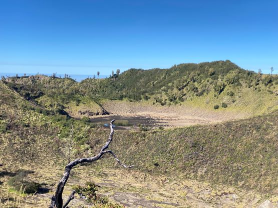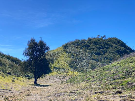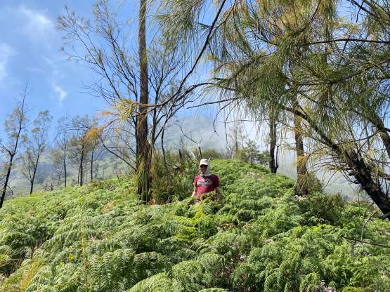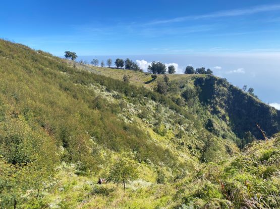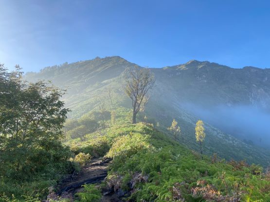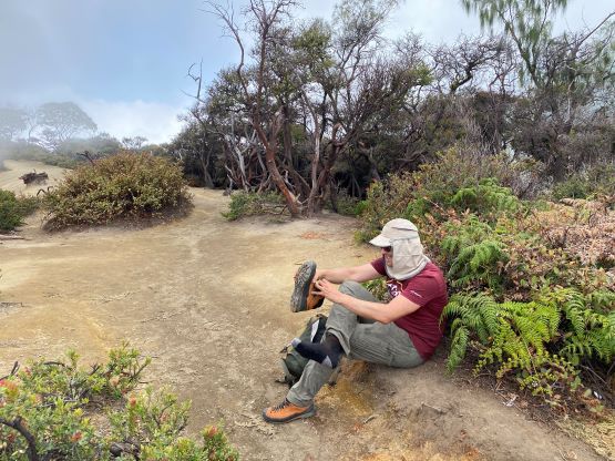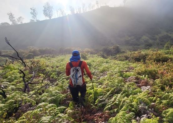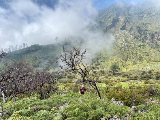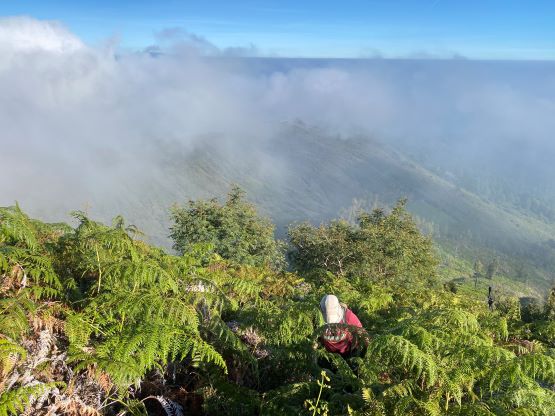 On the descent we were able to follow the “path” that we just made and got out of that true summit area with ease. Adam then proposed to follow the other route described in that reference trip report. I was not particularly happy about that because I always prefer to stick to the known and I especially dislike making gambling on difficult terrain, but I eventually gave in. Adam’s judgement was correct and we indeed found a better way to get back to the NW Ridge, with hardly any notable thrashing. The descent off the NW Ridge was also simpler as the gravity was now doing us favour. For bushwhacking the worst is on side-hill terrain, followed by uphill, and on downhill it’s never that terrible unless we are talking about thorny stuffs. In short time we were back into the ravine. The plan was to follow that lower trail out, but it didn’t seem to go towards the direction we wanted. I suspected it’s just an animal trail, so we bushwhacked back up to the Ijen crater rim. The rest of the descent was a piece of cake by comparison. I jogged most of the downhills and finished the round trip in under 7 hours. I had previously told the driver that we’d be back in 4 hours at the worst case scenario as I never anticipated so much bushwhacking, but thankfully I was able to catch cell reception on several parts of the route, so I was able to keep the driver updated.