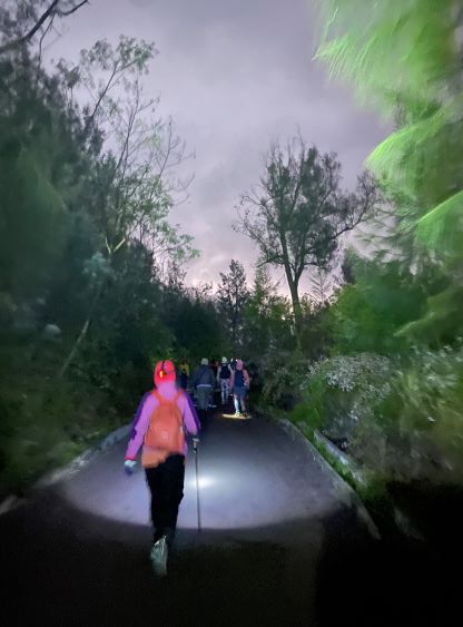 A few friends of mine recommended Ijen after knowing I’d be in the area, but I wouldn’t spend a day there just to see the crater lake. I understood that this lake is very important from tourism point of view, but I’m a peak-bagger and I needed a proper summit. The highpoints along the crater rim do not boast over 100 m prominence to be independent peaks, but the high point of the entire complex, namely Gn. Merapi boasts over 1200 m prominence. Adam and I were eventually convinced to give it a try despite the lack of “beta”. Those who logged this peak on Peakbagger likely did not ascend the true summit, and our “beta” was solely from the website gunungbagging.com. The information provided there was detailed enough to get the job done, but they did not provide a GPX track for us to follow. I also think their words are outdated as the bushwhacking was significantly harder than expected. This isn’t an objective that legally requires a guide, so we only hired a private driver of the day. The driver (Agus) came to pick us up at 4 am and we made to the park’s gate at 1800 m elevation by 5 am. Agus would be there waiting for our return, and there’s an entrance fee of ~10 dollars per person. This is an extremely touristy area with people pushing to sell us head-lamps, gloves and face masks. We had our own essentials but did briefly consider to buy a mask but didn’t bother in the end. In retrospect it wouldn’t be a bad idea to have one as this volcano farts large volume of gases rather frequently.
