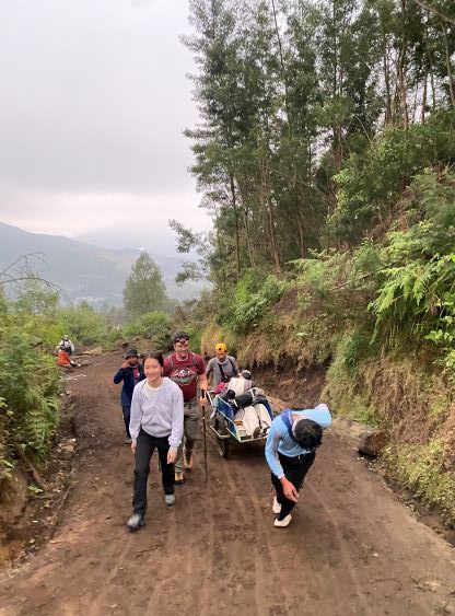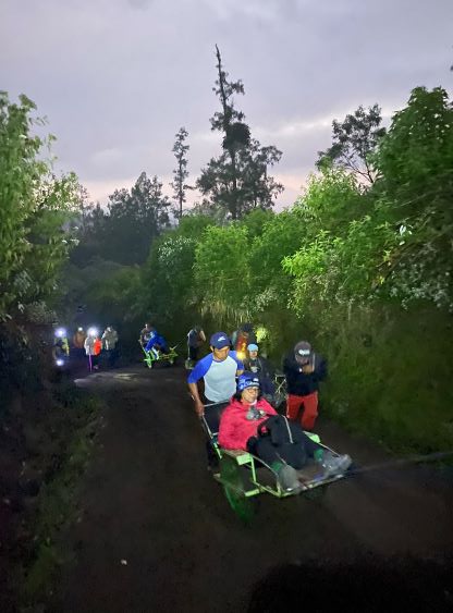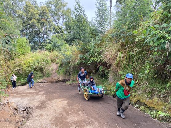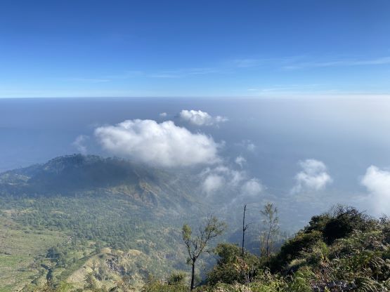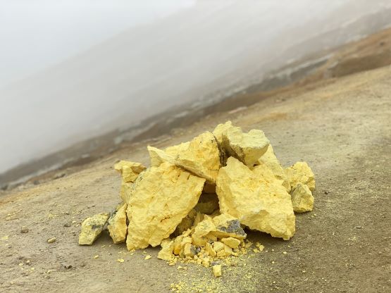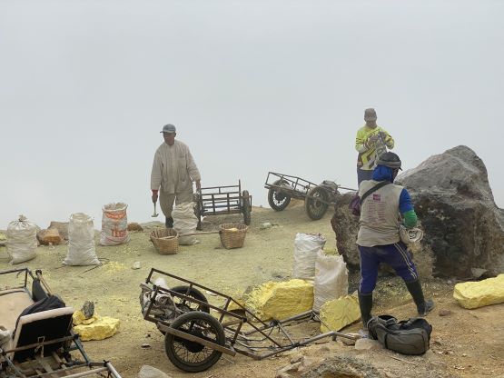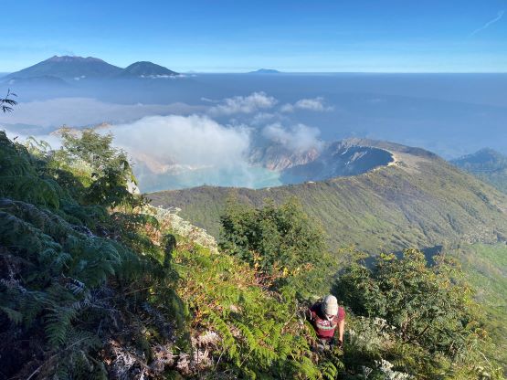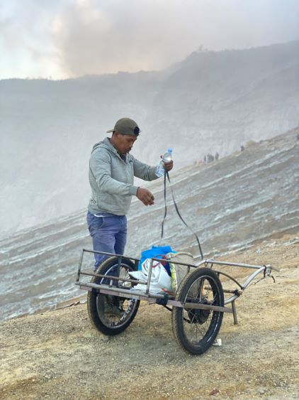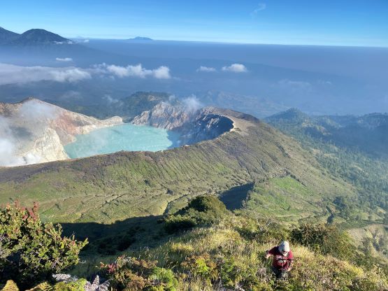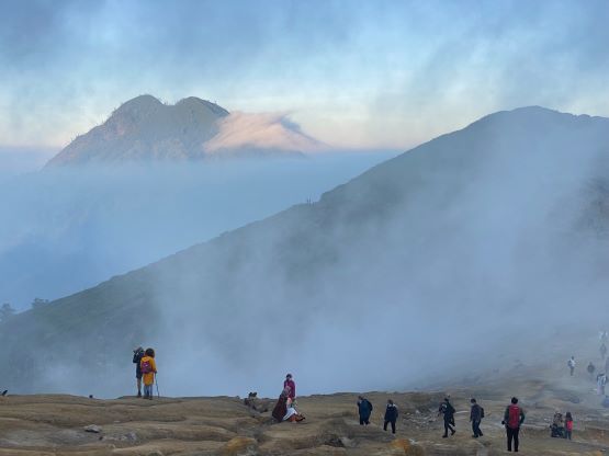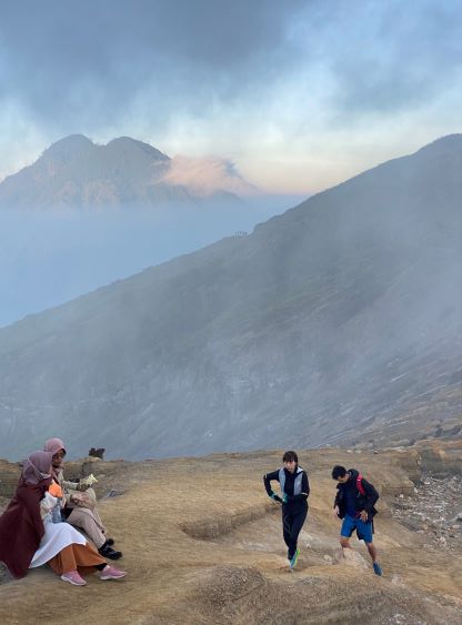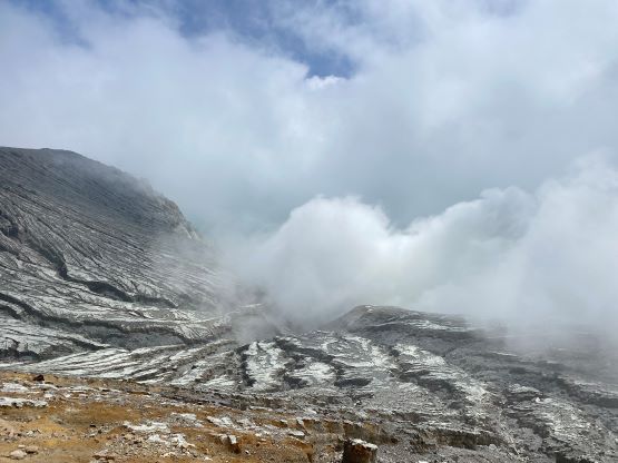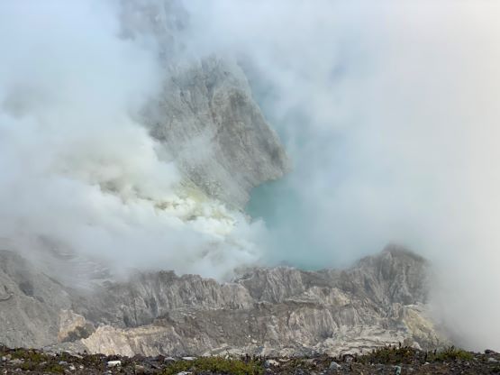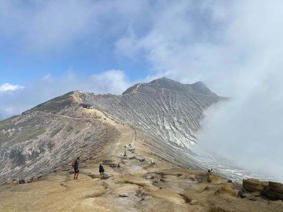 On the hour-long approach to the rim we passed about 100 people including some sitting in wheel carts being dragged up by the porters. They called those “Taxi” services. They tried hard to sell us the offer but we refused. The weather had been mostly cloudy but we soon learnt that the sky wasn’t actually obscured by the clouds, but rather by the fumes. The wind direction was not in our favour such that the whole touristy area around the rim was in a smoke white-out. The smell was terrible. Adam and I pushed on without doing any unnecessary lingering and we briefly came out of the smokes on the eastern rim, where we also got some glimpses of views down into the crater lake, apparently the largest acidic lake in the world. For everyone else this was already the destination, but for us this was just the approach.