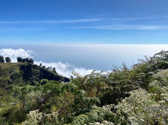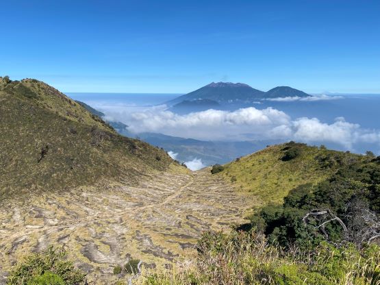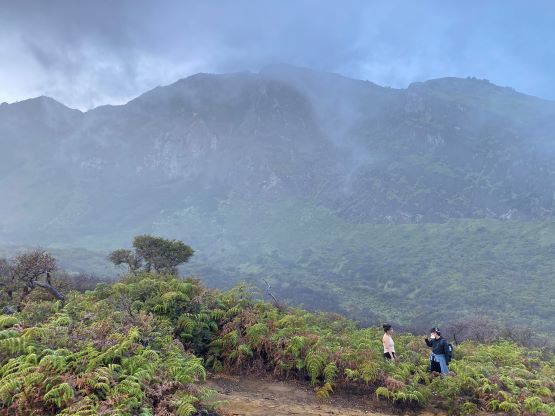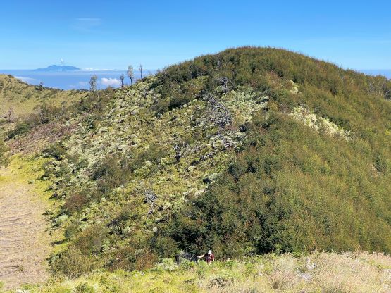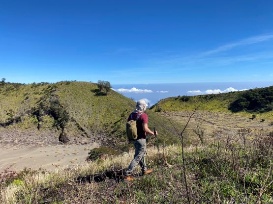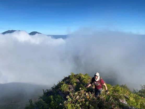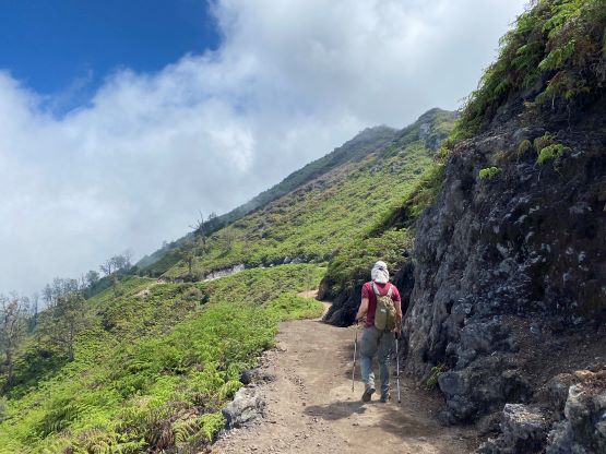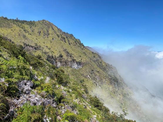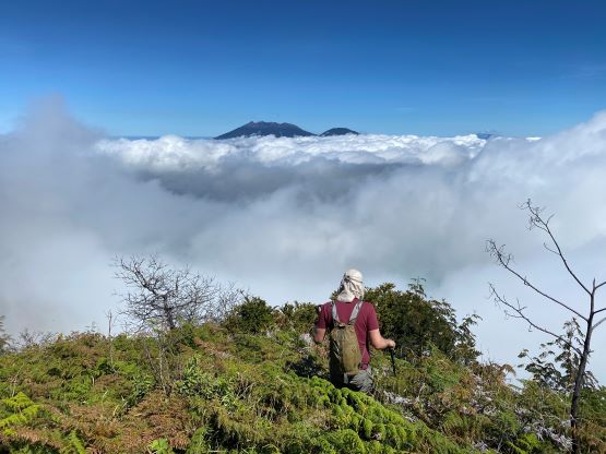 We searched back and forth trying hard to find the “vague trails” described in the Gunung Bagging website, but to no avail. We eventually decided to just commit to one path that seemed like a “trail”. The path disappeared in no time, and we thrashed down into the ravine losing about 30 m of elevation. This stretch took more than half an hour and the bushwhacking was quite bad. There were a few wetter sections (near some small creeks) and we got thoroughly soaked. We did find a “trail” near the bottom of the ravine and I thought we were relieved, but I was being too optimistic. The trail disappeared in the ravine and we had to do more bushwhacking to gain the lower NW Ridge of Gn. Merapi. We found the trail on the NW Ridge again, but the state of this trail was horrible. It was essentially a bushwhack even though we could see the path for most of the time. For the few sections that we lost the trail, the thrashing was horrible and easily reached the 4th level in our PNW grading system. Thankfully the state of this route didn’t get too much worse as otherwise we probably would turn around. Several hundred of meters were dispatched on this NW Ridge and then we topped out on the upper crater rim.
