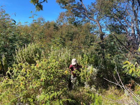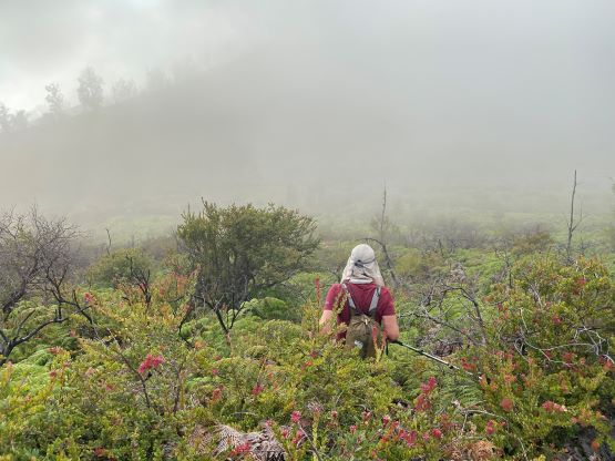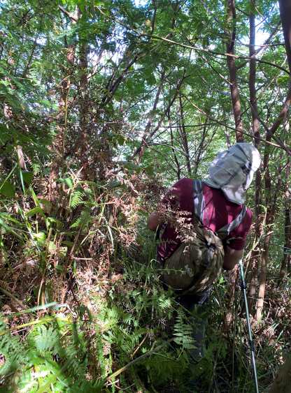 The traverse across the rim in a clockwise direction started off easily with mostly open terrain, but soon deteriorated. The true summit is hidden behind the obvious “summit” ahead of us, so we had to traverse around this fore summit. The other option was to ascend up and over the false summit, but the bushwhacking wasn’t particularly appealing. The route that we chose traversed low and around, but still involved a stretch of horrendous bushwhacking. To make it worse, we were on side-hilling terrain and for at least 50% of the time I was unable to see the ground. Full body wrestling was required for at least an hour and I would grade this part “BW4” for the least. The only reason that we kept going was the lack of thorny plants, but they weren’t completely absent. For once in a while we would come to one and they often surprised me. I ended up having to pick thorns out of various parts of my body after the trip. Thankfully with perseverance we pushed it through and made to the summit ridge. The final stretch leading to the true summit was unfortunately also covered in that thick forest and required another great deal of thrashing. At this point we just didn’t give a fuck. The true summit was completely covered in the forest and offered no view whatsoever. There are two high point contenders and I insisted to thrash to the farther one just in case some surveyors come here (maybe in 50 years) and claim that we didn’t actually make the summit. We didn’t want that to happen.