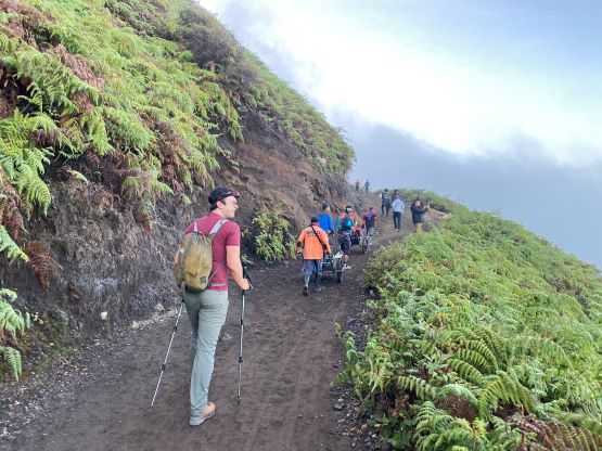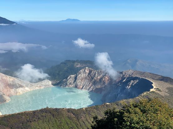 On the hour-long approach to the rim we passed about 100 people including some sitting in wheel carts being dragged up by the porters. They called those “Taxi” services. They tried hard to sell us the offer but we refused. The weather had been mostly cloudy but we soon learnt that the sky wasn’t actually obscured by the clouds, but rather by the fumes. The wind direction was not in our favour such that the whole touristy area around the rim was in a smoke white-out. The smell was terrible. Adam and I pushed on without doing any unnecessary lingering and we briefly came out of the smokes on the eastern rim, where we also got some glimpses of views down into the crater lake, apparently the largest acidic lake in the world. For everyone else this was already the destination, but for us this was just the approach.