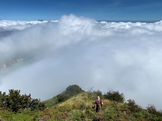 We searched back and forth trying hard to find the “vague trails” described in the Gunung Bagging website, but to no avail. We eventually decided to just commit to one path that seemed like a “trail”. The path disappeared in no time, and we thrashed down into the ravine losing about 30 m of elevation. This stretch took more than half an hour and the bushwhacking was quite bad. There were a few wetter sections (near some small creeks) and we got thoroughly soaked. We did find a “trail” near the bottom of the ravine and I thought we were relieved, but I was being too optimistic. The trail disappeared in the ravine and we had to do more bushwhacking to gain the lower NW Ridge of Gn. Merapi. We found the trail on the NW Ridge again, but the state of this trail was horrible. It was essentially a bushwhack even though we could see the path for most of the time. For the few sections that we lost the trail, the thrashing was horrible and easily reached the 4th level in our PNW grading system. Thankfully the state of this route didn’t get too much worse as otherwise we probably would turn around. Several hundred of meters were dispatched on this NW Ridge and then we topped out on the upper crater rim.