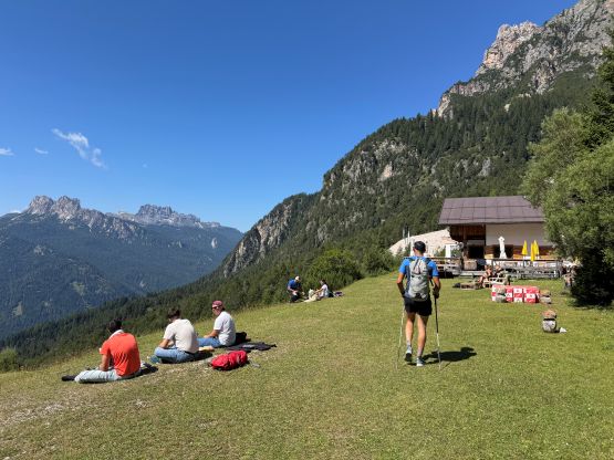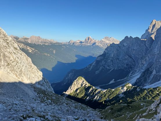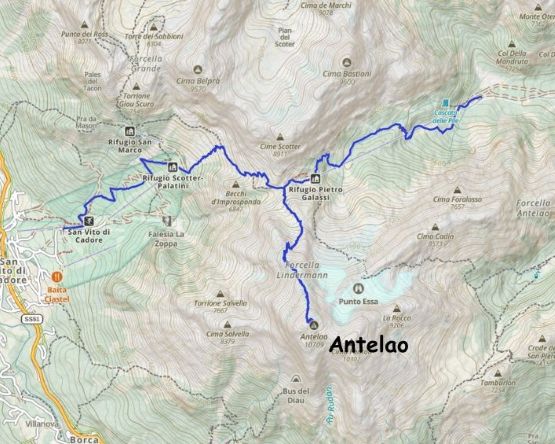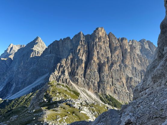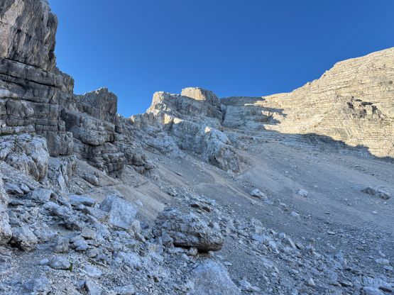 The next morning I got up at 4:30 am to start hiking by 5 am. Adam was also awake and his plan was to put more mileage into the vehicle to tag two of the easy P1200+ m “Ribus” in the vicinity. This rental car was already 2000 km overdue for maintenance but the servicing was not part of our responsibility. I very much doubt the company had ever come across drivers putting 10,000 km into the odometer in less than a month. I did email them about the concerns and we were currently waiting for their response. Adam preferred to minimize the chance of getting a flat tire so I would make a traverse across the massif and exit westwards to San Vito di Cadore where he would pick me up on paved roads. I liked this plan because then I would get to see two sides of this mountain, even though this meant an additional 200 m descent on my way out. There aren’t much worth noting about the approach to Rifugio Galassi that climbers usually use as a “base camp” for Antelao. I wasn’t pushing for speed but I kept a steady pace and did not stop for a break until arriving at the hut besides donning some sun protection.