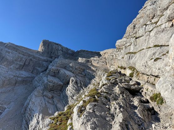 The only reason why I stopped at the hut was to clean my sunglasses. I’ve not someone who minds dirtiness but my sunglasses were getting to the point to obscure my vision and the hut was the most convenient place that had a soap with running water. I was never able to fully clean them up but could make do for at least a few more days afterwards. From the saddle at the base of the route I still had 1100 m elevation to gain and again, I was never aiming for speed but I disliked stopping for no purpose. I simply kept plodding at a steady pace and it was obvious that I was doing quite well on time. I could see a party or two ahead moving at a reasonably fast pace but I was definitely closing in the gap. The presence of these parties made me speeding up while traversing towards the ramps and ledges at the start of the scrambling sections. The route-finding on Antelao was very difficult that even with my Rockies experience I still got off route 3 or 4 times. I picked a difficult start right off the bat, which was fine, but the mistakes I made higher up required me to backtrack. As a result I did not catch up to the party ahead until way up high on the north ridge. These series of ramps and ledges to get out of the lower amphitheatre was definitely harder than I thought.