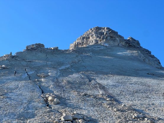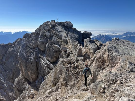 I then stayed on or slightly to the right of the crest of the ridge and the terrain was mostly class 2 slabs covered in some pebbles for a long period of time. There were a few narrow sections and at least one tricky rock band requiring a 4th class move or two. Overall I found this middle section of the route “not too bad” and I did successfully pass the party-of-two ahead. Not far after passing them I was at the bottom of the infamous slabs and this was the site of the 2014 landslide. The entire upper layer of the rocks were peeled off so the next 100 m elevation gain was mostly on smooth slabs covered in pebbles and dirt. I could totally see why Antelao isn’t attempted often because this section was quite risky in many ways. The scrambling was not difficult (mostly 3rd class at the maximum) but a mistake could easily be fatal. I came across the spot where Rob’s party got belayed by their guide. There’s already a fixed rope but I did not use it as I never thought it was really needed. I then caught up to the soloist ahead (Giovanni) who had been leading the gang on Antelao on this day. I more or less did the rest of the ascent and descent together with this guy. Giovanni had been working on the 83 3000ers in the Dolomites and our paces were mostly on par with each other. Above the slabs we started to encounter some fresh snow but there wasn’t much accumulation to be a problem. Giovanni and I altered leads for the complicated summit block and we did lots of exposed traverses, some 4th class climbing and a few backtracks before eventually standing on the summit. The true summit was a few meters beyond the religious cross so I went there to be 100% sure. My time to summit was 3 hours 20 minutes from the car. Again I was not pushing for speed but I basically did not stop. I never ate anything for the entire 1900-m grunt.