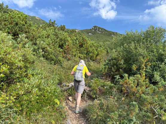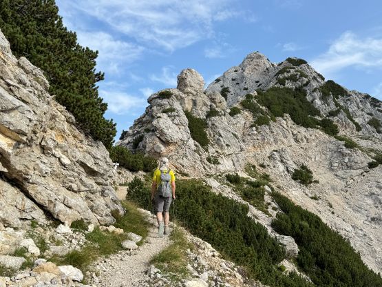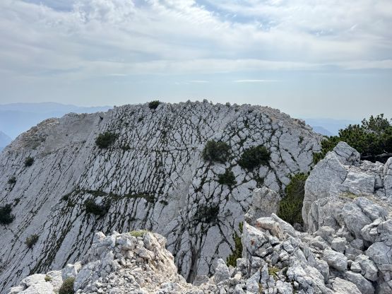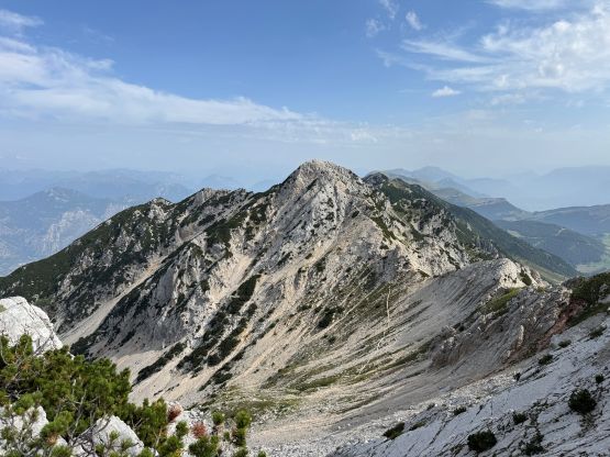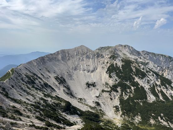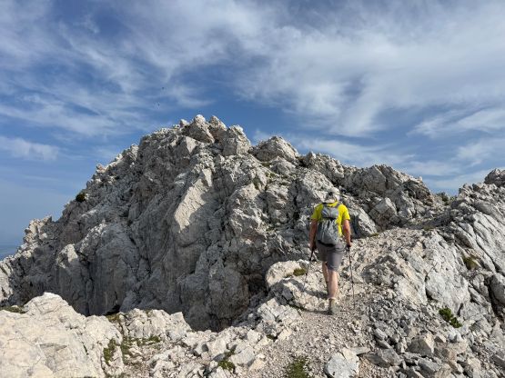 Adam opted to lead the pace so all I needed was to put one foot in front of another. Right off the bat at the first corner on the trail we saw a massive pile of human shit. The first kilometer of this trail was in the forest but it quickly joined the “standard route” coming up from Novezza. The trail was rocky just like most of the trails in the Dolomites, but at least it’s a good trail. A long while later we crested the ridge under the southern P100m sub-summit which has a few confusing names. The route traverses across the east face of this sub-peak gaining and then losing 50 m precious elevation. Adam and I agreed to tag that peak on the way back since it only required an additional 50 m elevation gain. To reach the summit of Cima Valdritta there was some scrambling involved but nothing fancier than Class 2. I wasn’t anticipated much from this outing but the views were quite nice, so we lingered up there for quite a while.
