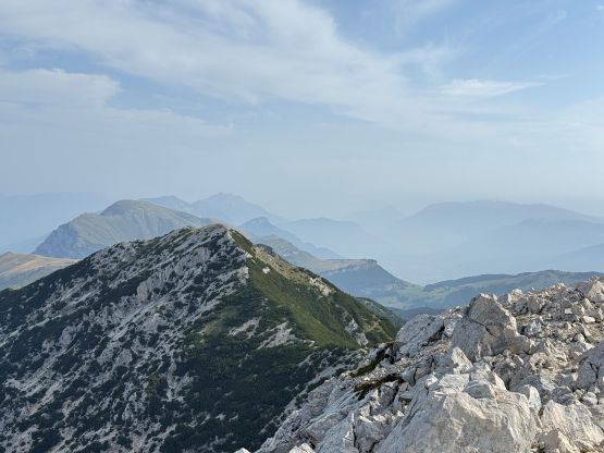 At this point I finally got some messages from Erica and Caspar that they wouldn’t be interested in Piz Kesch but they would be down to give Ortles/Ortler a shot, and Caspar had managed to successfully book the hut stay for the three of us. This necessitated a last minute change of plan. Adam proposed that we should drive a ways down south into the Apennines to climb Corno Grande and I agreed. This also meant that we would be driving 7+ hours afterwards, so we quickly descended. We still opted to tag that bonus peak for simple reason of why-not, but it required more effort than we thought. There’s no maintained trail to the summit so we needed to ascend some steep talus and grass fields. There are also two contenders for the summit and to reach the second one required some difficult scrambling. I attacked the ridge direct and it was 4th class. Adam found a way to bypass by diving into the bushes down skier’s left, and reported his route being “class 2”, albeit longer. This peak is known as Cima Prà della Baziva on most sources online but is labelled as “Cima Fontanelle” on peakbagger.com. It doesn’t seem to have an official name on the government’s topographic maps. I don’t know which advice to listen to but I would prefer the former.