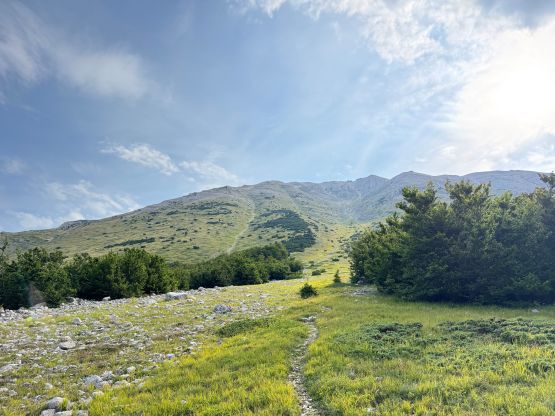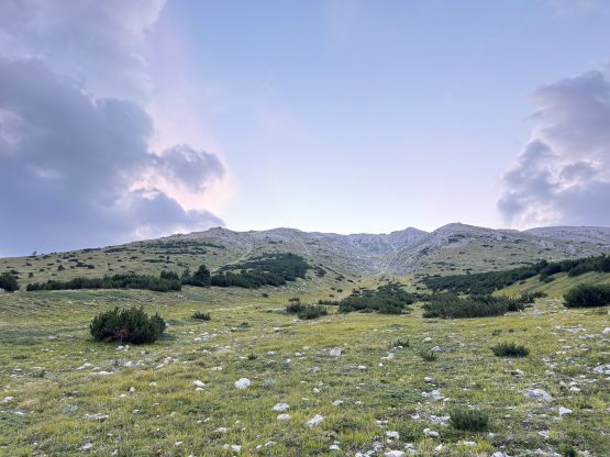 The newest weather forecast indicated the only possible window without significant chance of thunderstorm was between 6 and 8 am so I had to aim at summitting no later than 8 am. There were about 1500 m elevation gain, mostly off-trail so the latest I wanted to start hiking was 5 am. Adam unfortunately couldn’t manage that so he sat this one out in the car. The start of the route was miserable as expected as there’s no path to speak of, and I had to wallow through the knee+ deep wet grass with some stinging nettles in the pitch dark. Thankfully the field gave way to an old dirt road, and it seemed to me that David’s track was starting to follow this road. The road gave way to a path higher up, but the trail was definitely not maintained officially. I lost the trail a couple times but always managed to pick it up again. It was definitely a haul to reach the gigantic ascending gully but it actually didn’t take me too long.