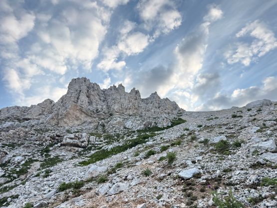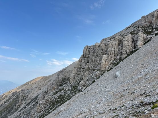 This position marked the 1000m grunt. The route was straightforward but this one felt more like a typical scramble in the Canadian Rockies instead of a peak in Europe. There was absolutely no defined path so I mostly just went straight the fuck up. The lower half of the gully below the hourglass was straightforward but the upper half was sort of loose. I had to pick the route more carefully to avoid the treadmill scree, and needless to say, the ascent was not enjoyable. I eventually crested the upper plateau but then picked a bad route up the final 150 m summit block. I thought it wouldn’t be much different so went straight up the SW flanks, and punished myself with treadmill scree that’s loose even for a Rockies veteran. It was literally one step up, two steps down… Thankfully it wasn’t everlasting so I did eventually top out onto the summit ridge and attained the summit shortly after.