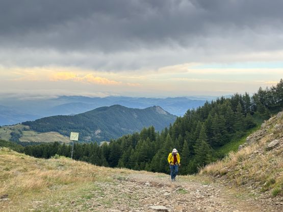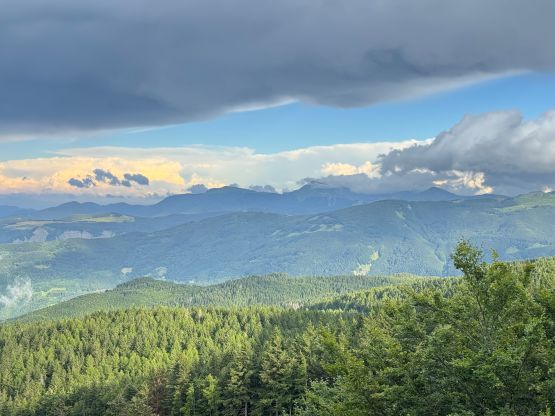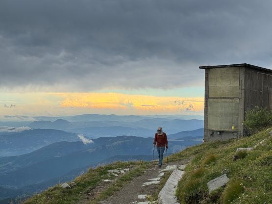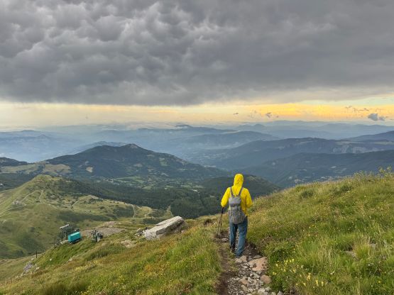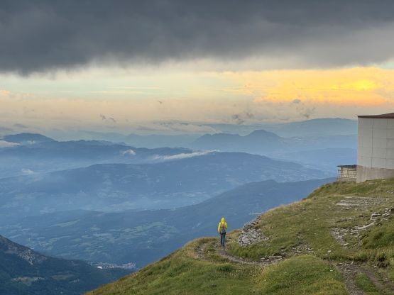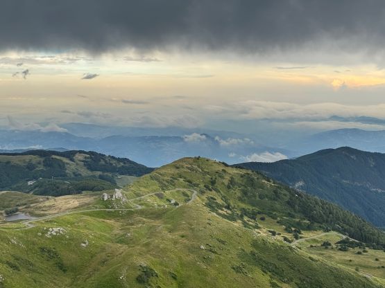 We actually got some excellent views due to the time of the day and the storms around so the plan was working out nicely. I followed Adam running down the NE Ridge and then we took our time leisurely walking back to the ski lift. The lift was not in operation anymore (not surprised) and the toy cars were also locked. We had no choice but to walk down that final 200 m to the trail-head village where we parked our vehicle. The trail was unfortunately in a terrible shape so we basically just bushwhacked our way down. The bushwhacking was more like “walking in open forest” so it wasn’t too bad. Our ascent was 500 m and descent was close to 700 m and our round trip time was under 2 hours. The weather was promising in the Dolomites on the following day so we had another 4 hours of driving to do. Adam and I had to take turn doing that but we did eventually position ourselves in the vicinity of Trento by 1 am. There were several easy “Ultras” to choose from and we picked Monte Bondone, the easiest of all.