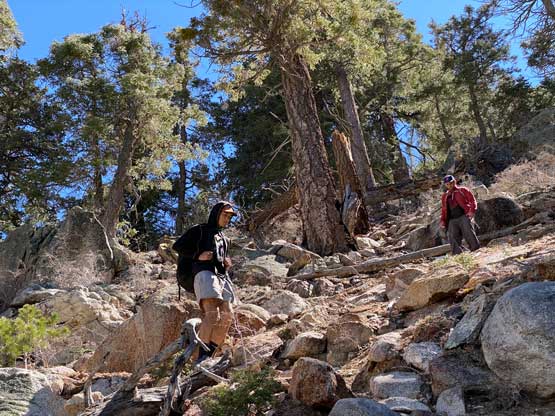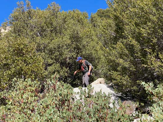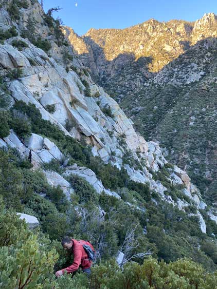 The decision for the egress day was to get out, drive to Tijuana and back into U.S. before dark so there were a lot of things needed to be done. Doug and I got up in dark and made a head-start again. About 20 minutes later we were able to turn off the head-lamps. The route-finding felt more confusing to go up than two day earlier, likely because the gullies diverge on the ascent but converge on the descent. We almost got off route by taking a wrong valley to the right, but thankfully I had a habit to consult with GPS every few minutes. We loaded up the water bottles at the last possible resource and entered the correct valley to the left. The next few hours were spent grunting up the boulders and game trails. That class 4 step did not feel any easier than two days earlier since climbing up required more muscle strength than down. Eventually we rejoined the better-defined path at that traversing section where the other team also showed up. Arthur also caught up to us at this stage and we did the rest of the re-ascent to Blue Bottle col in a group-of-five. The rest of the hike-out was boring and mundane and not worth to document much.